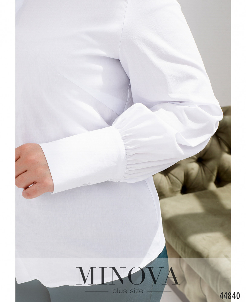 Стильная классическая рубашка батал с отложным воротничком. На рукавах длинные манжеты, на них по три пуговицы. Крой прямой, спереди - пуговицы на супатной (потайной) застёжке, прикрываются верхней планкой. На груди диагональные вытачки. Карманов нет.