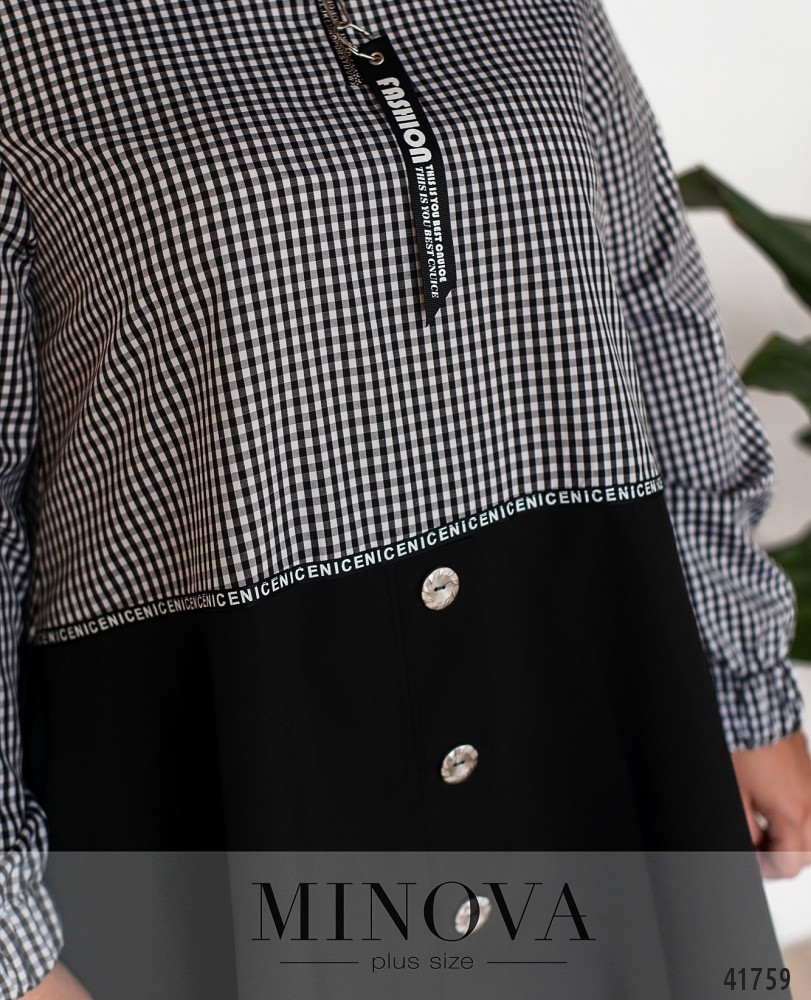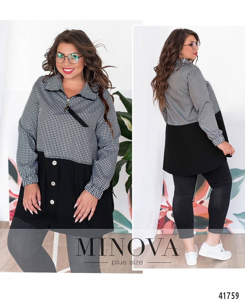 Стильная длинная рубашка батал с декоративными пуговицами на подоле. Воротничок отложной, под ним - рабочая молния до середины груди. Рукава со вшитой в манжеты резинкой. Карманов нет.