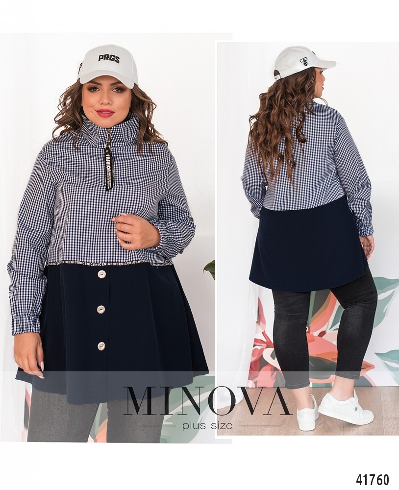 Стильная длинная рубашка батал с декоративными пуговицами на подоле. Воротничок отложной, под ним - рабочая молния до середины груди. Рукава со вшитой в манжеты резинкой. Карманов нет.