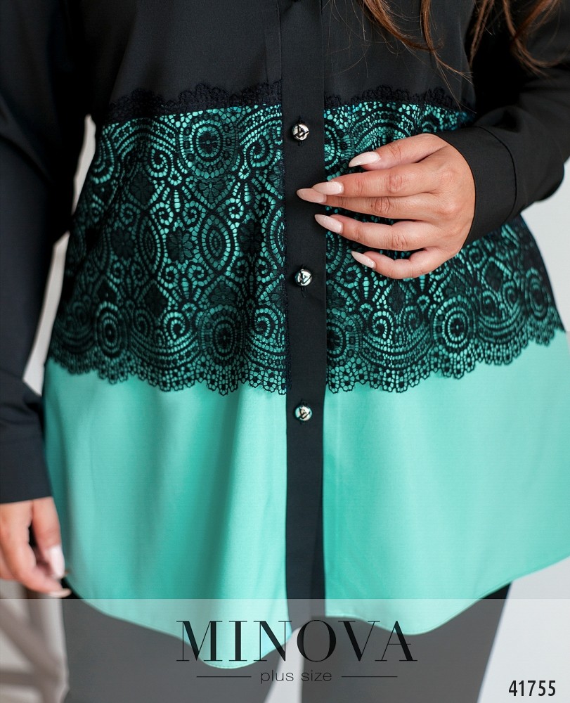 Романтичная рубашка батал с кружевом на талии, застёгивается на ряд пуговиц спереди на планке. Воротничок-стоечка, рукава с манжетами, на манжетах по одной пуговице. Без карманов.