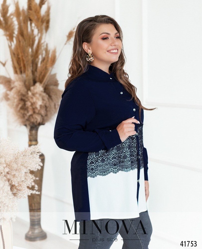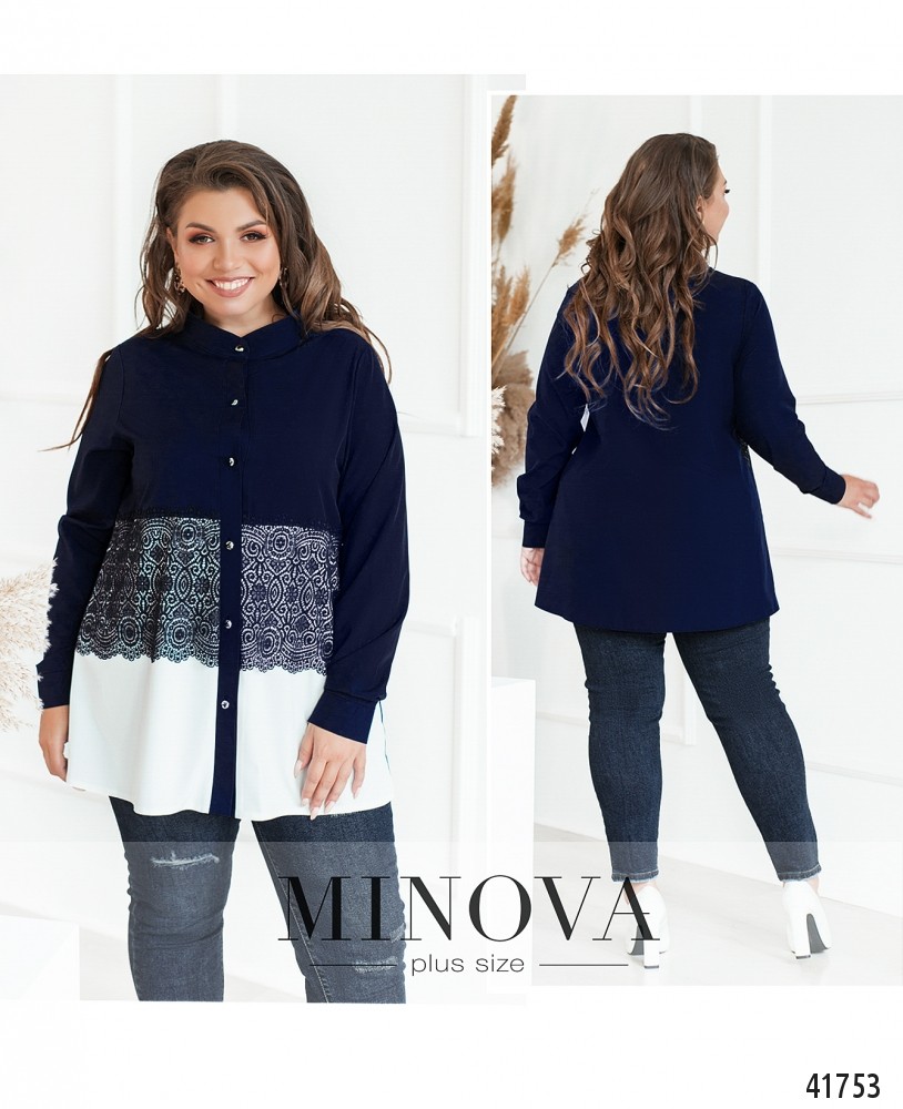 Романтичная рубашка батал с кружевом на талии, застёгивается на ряд пуговиц спереди на планке. Воротничок-стоечка, рукава с манжетами, на манжетах по одной пуговице. Без карманов.