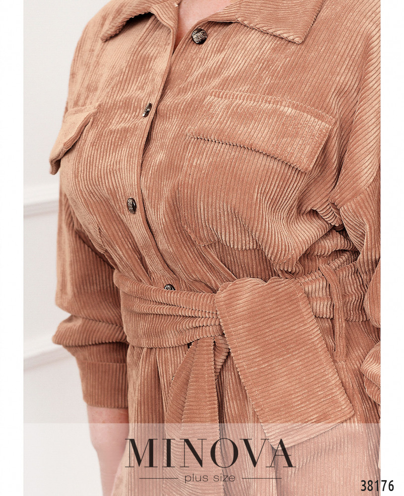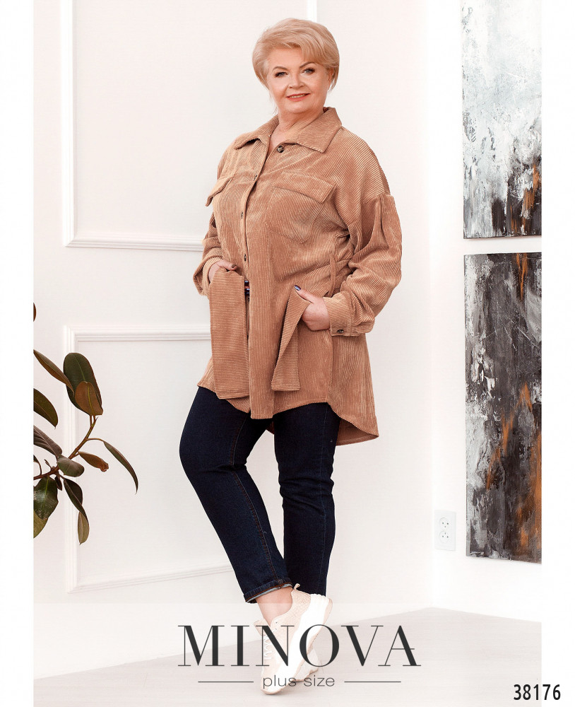 Очаровательная рубашка плюс сайз с широким поясом и двумя шлейками под пояс по бокам. На груди – накладные карманы, воротничок отложной, застёгивается рубашка на ряд пуговиц спереди на планке. На рукавах – небольшие манжеты с одной пуговицей. Без подкладки. Подол по спинке чуть длиннее.