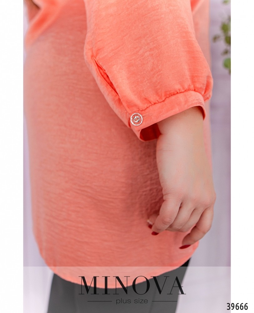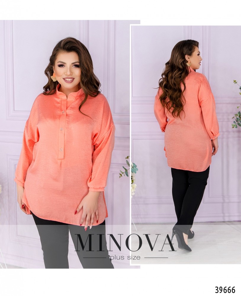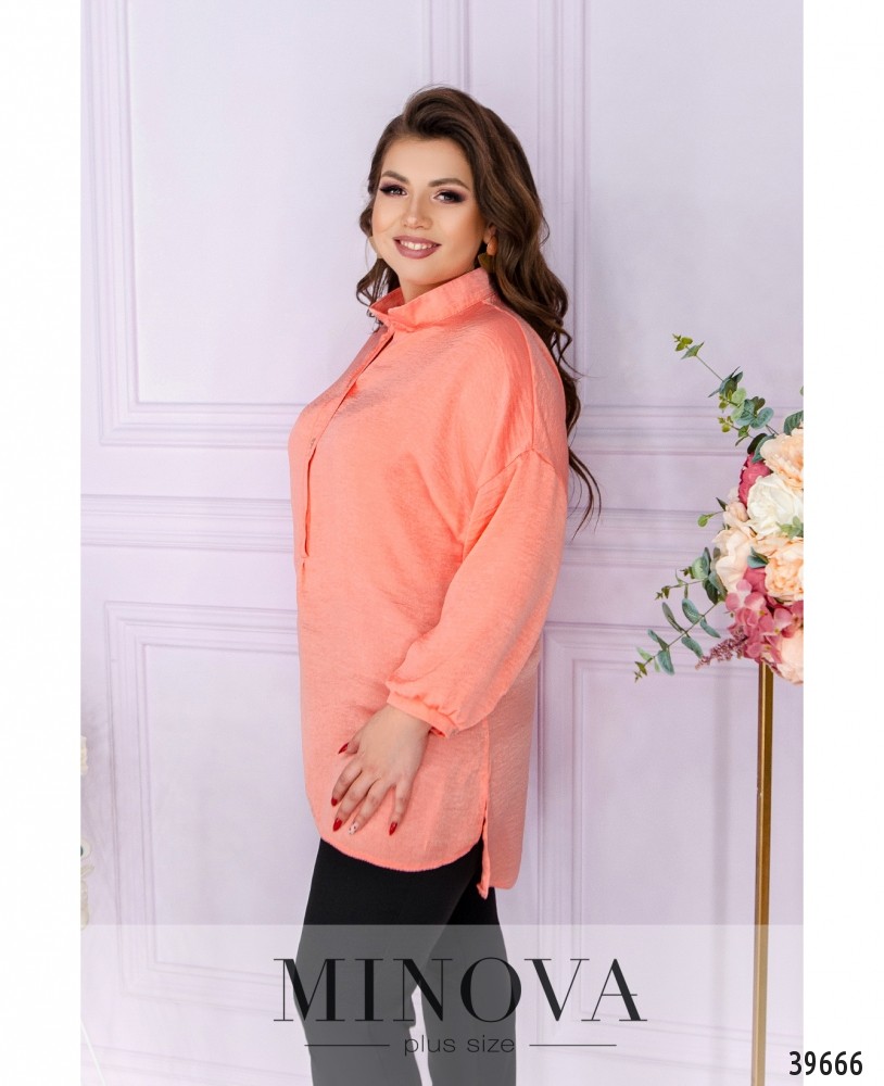 Женственная рубашка большого размера с воротничком-стоечкой, застёгивается на ряд пуговиц спереди на планке, до груди. Рукава с небольшими манжетами, без пуговиц. Подол асимметричный, по спинке чуть длиннее. По бокам подола - небольшие разрезы.