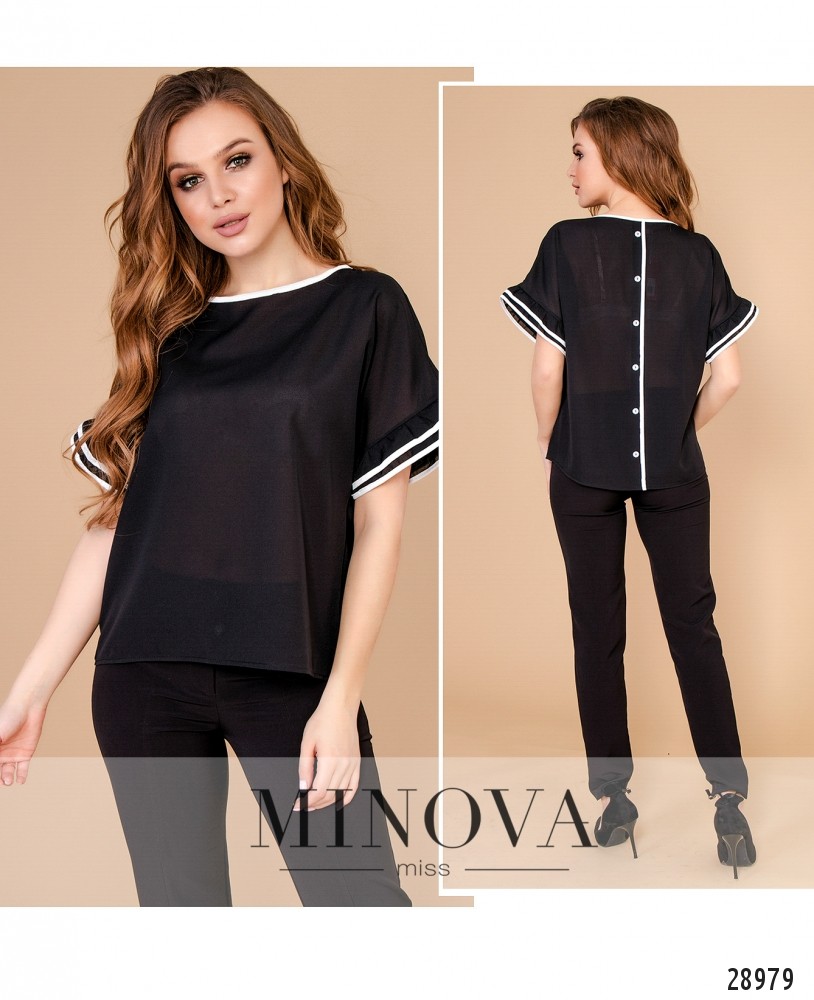 Свободная блуза прямого кроя с рукавами –воланами. Спинка украшена рядом декоративных пуговиц. Горловина, рукава и планка на спине выделены контрастным кантом.