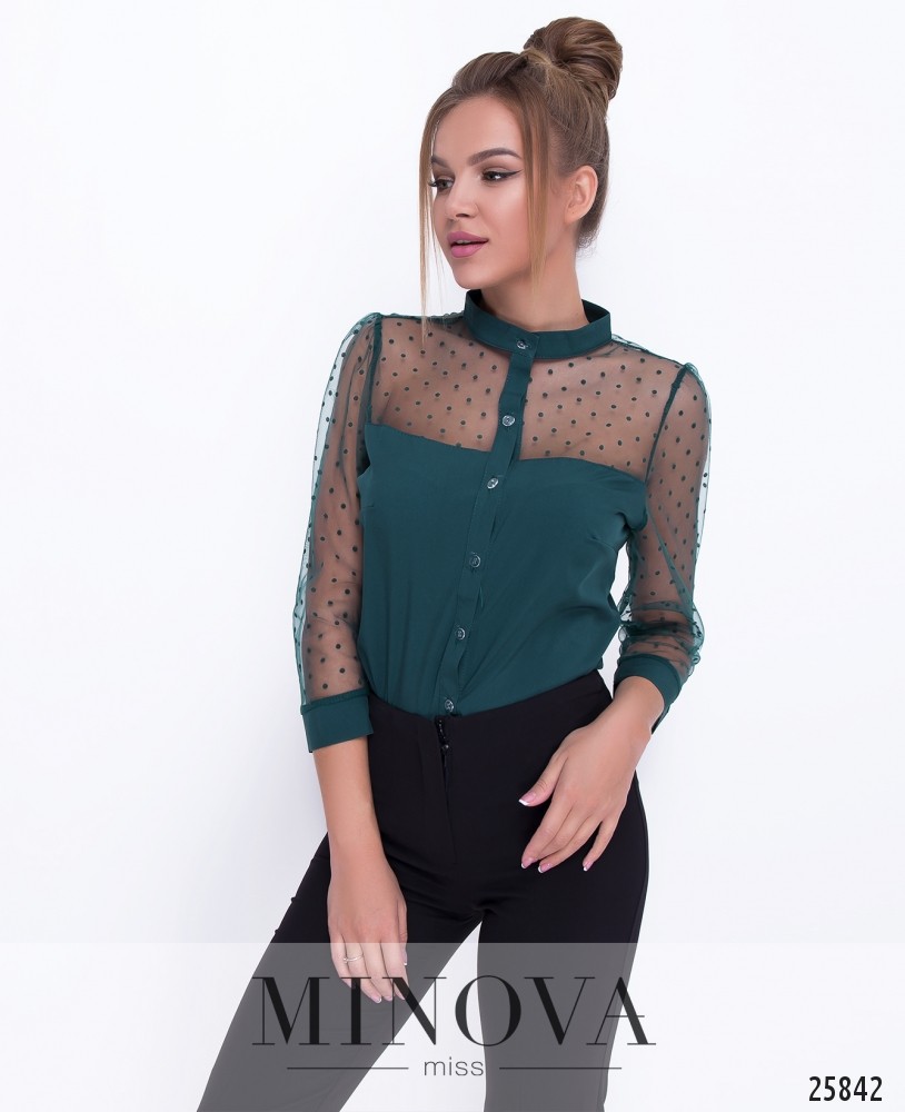 Элегантная блуза прямого кроя с полупрозрачной сеткой в горошек и рукавами ¾. Блуза с воротником-стойкой застегивается на пуговицы. Линия отреза проходит над грудью. Рукава отделаны манжетами без пуговиц.