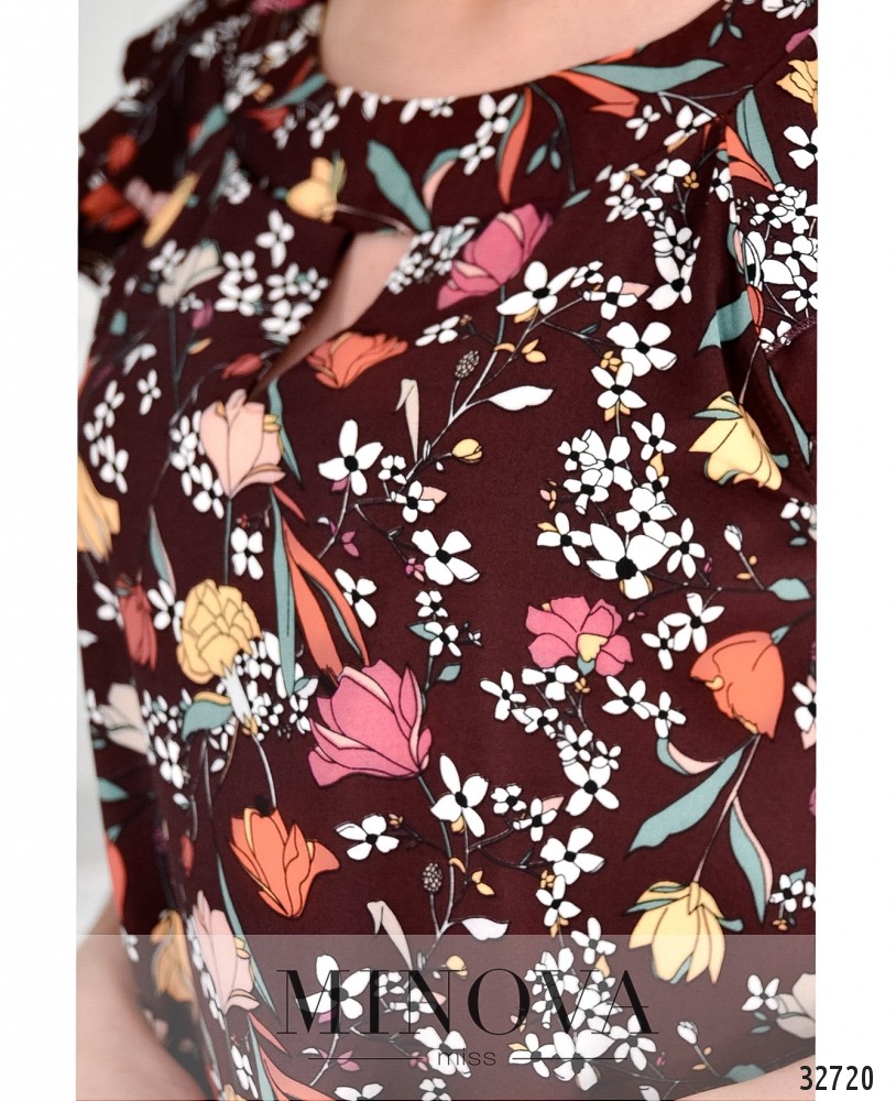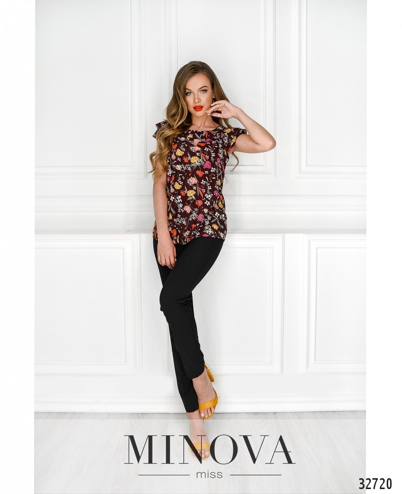 Живописный принт этой блузки из каталога летней одежды Minova особенно стильно смотрится на тёмном фоне. Любите быть неотразимой, создавать праздничное настроение? Этот вариант именно для вас! А если нравится фасон, но нужно что-то более строго-деловое, остановите свой выбор на белом варианте. У блузы широкая горловина, спереди под воротом небольшой вырез. На рукавах – два ряда нежных рюш. Крой прямой, без карманов и застёжек. Материал воздушный, не тянется, не просвечивает. Украсит гардероб девушек с «грушевой» или «яблочной» фигурой.
