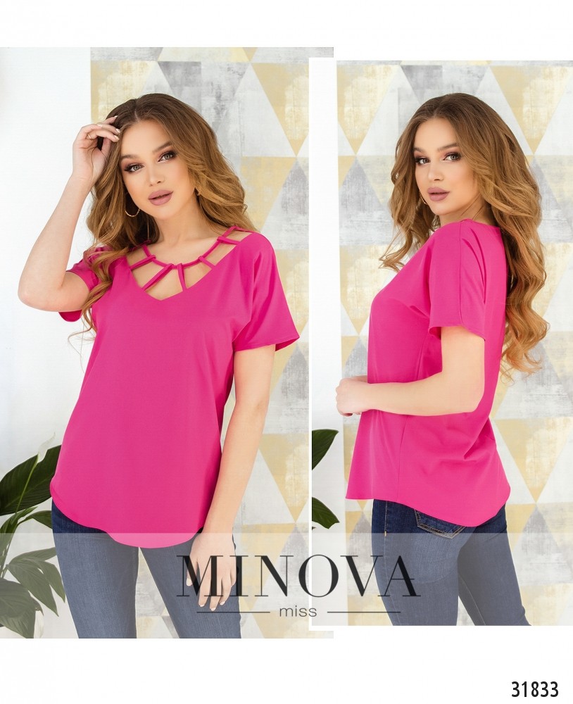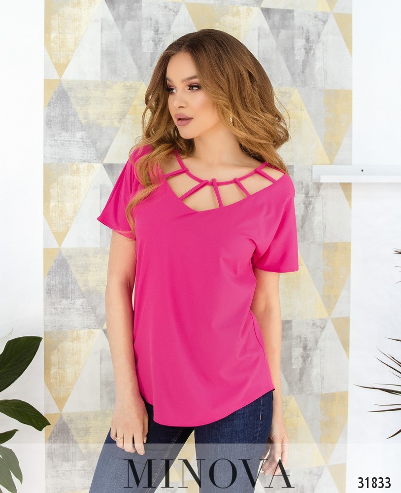 Яркий топ с оригинальной горловиной. Топ прямого кроя с короткими рукавами и закругленным подолом. V-образное декольте украшено декоративными петельками.