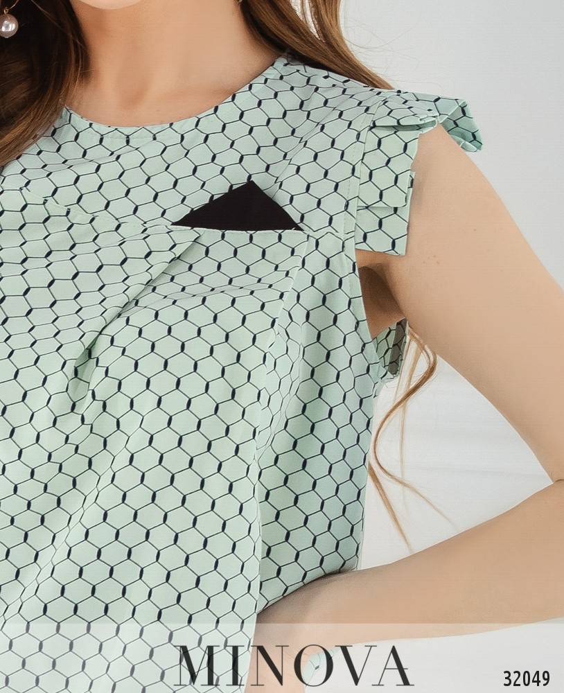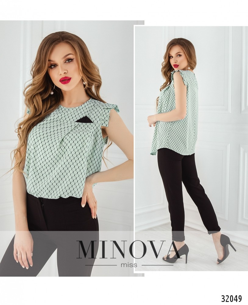 Свободная блуза без рукавов. Блуза, отрезная от кокетки, украшена декоративным кармашком. Рукава отделаны оборкой. Подол закруглен. Спинка отрезная кокетки. Горловина застегивается на пуговицу на спине.