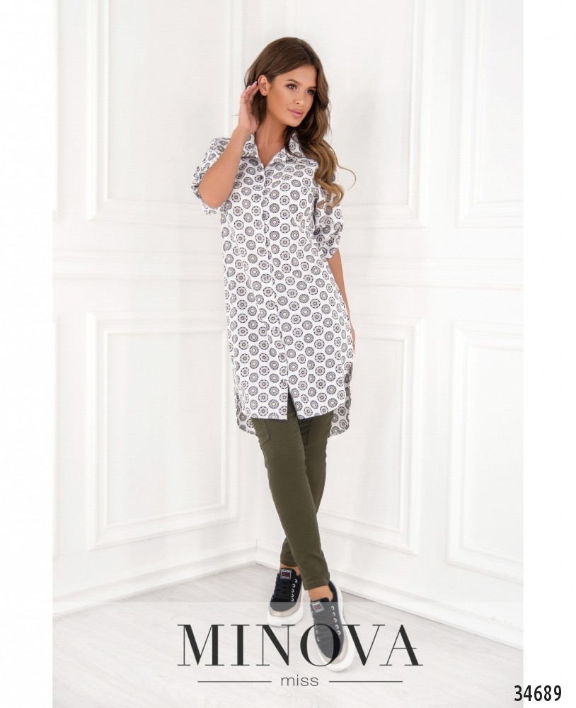 Если для вас главное – свобода и комфорт, то стоит купить для своего повседневного гардероба лёгкую тунику из нового каталога Minova. Туника пошита по фасону платья-рубашки, она длинная, мягкая и приятная к телу. Воротничок отложной, полный ряд пуговиц от воротника до подола. Рукава длиной ¾, без манжет. Подол по спине чуть длиннее. Карманов нет. Принт приятный и неброский: ряды круглых цветов, на светлом или тёмном фоне. Такой принт добавляет стройности и роста, поэтому лучше всего будет смотреться на фигуре типа «груша» или «яблоко». Можете носить тунику как самостоятельный элемент одежды или сочетать с джинсами, обувь может быть и спортивной, и классической на каблуке любой высоты. Украшение не входит в комплект. Пояс/аксессуар не входит в комплект.