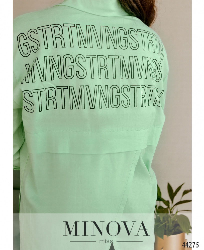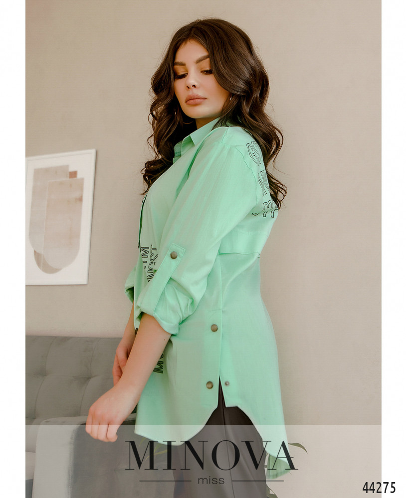 Длинная стильная рубашка с накаткой и фурнитурой хорошего качества. Воротник отложной, рубашка застёгивается на ряд кнопок спереди на планке. Украшена принтом на полочке. Рукава регулируются с помощью ленты и кнопки, на манжетах также по одной кнопке. По спинке подол отрезной, снизу запахнутый, спинка также украшена принтом. По бокам подола - разрезы, застёгиваются на кнопки. Карманов нет.