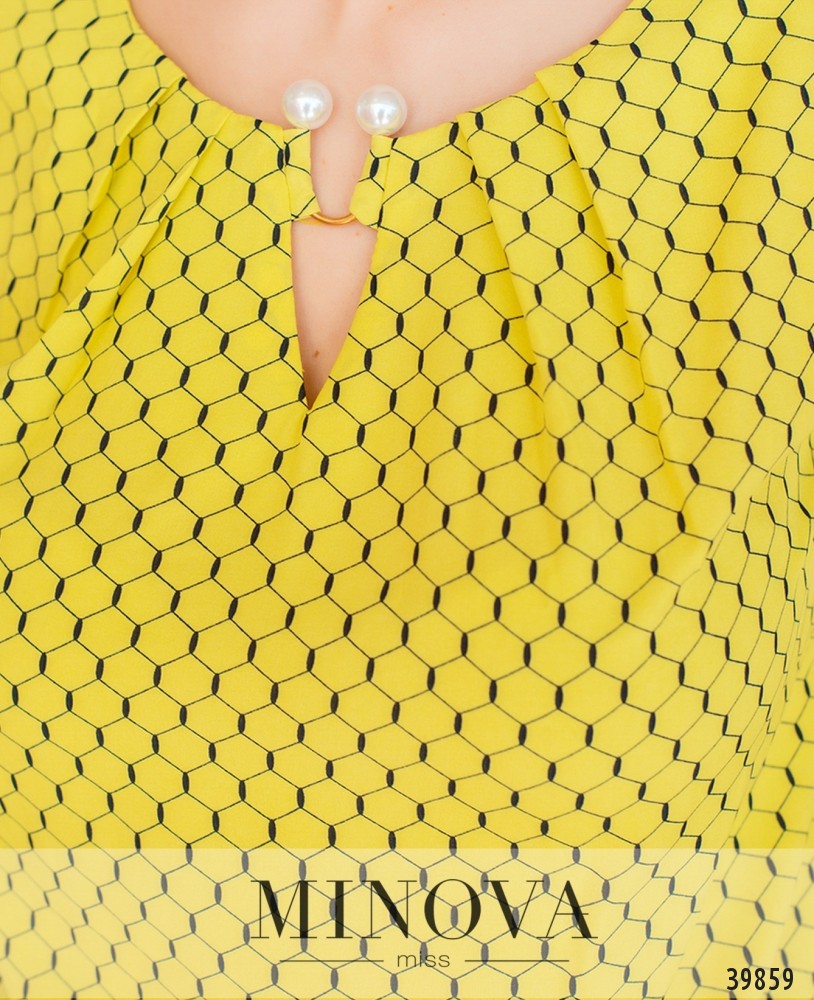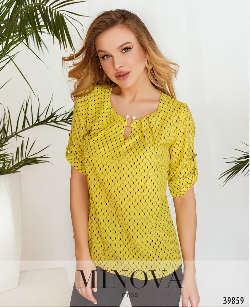 Очаровательная блуза без застёжек и карманов, украшена металлическим декором на полукруглом вырезе горловины. Рукава без манжет, регулируются на пуговицу и ленту. Ткань под горловиной присобрана.
