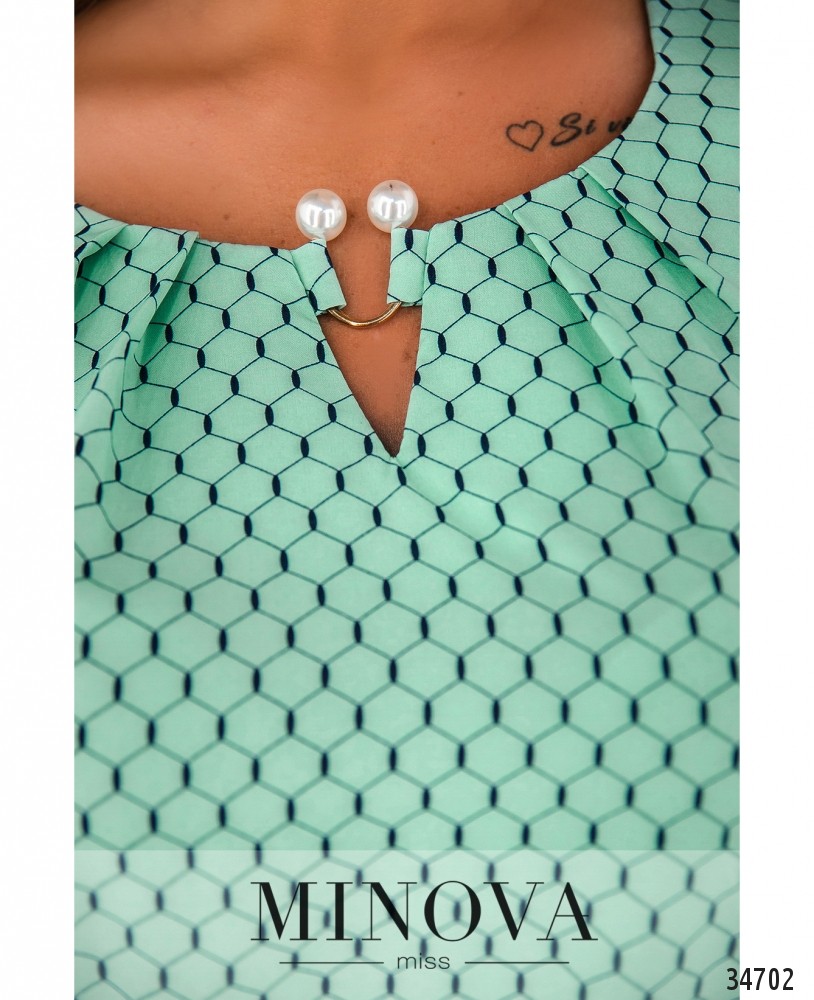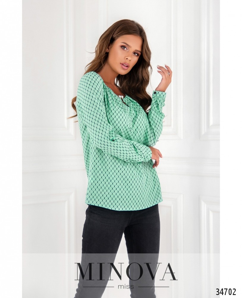 Очень нежная, лёгкая и приятная к телу и на вид блуза из новой коллекции Minova. Блуза с полукруглым вырезом горловины, под ним – несколько вытачек-оборок, которые создают эффект А-силуэта. Застёжек и карманов нет. Рукава полной длины, но их можно укоротить с помощью ленты и пуговицы. На рукавах – неширокие манжеты с одной пуговкой на ножке. На вырезе горловины – небольшая металлическая полукруглая «брошка» с «жемчужными» наконечниками. Крой свободный, а расцветку выбирайте в зависимости от своего привычного гардероба и требований к дресс-коду – можно выбрать пастельный оттенок с принтом в виде пчелиных сот, в наличии также чисто белый и красный вариант, и самые нарядные модели – с акварельными цветами, которые любой наряд сделают праздничным и радостным! Рубашка такого фасона будет удачно смотреться на любой фигуре.