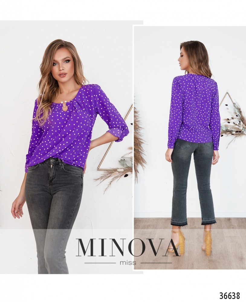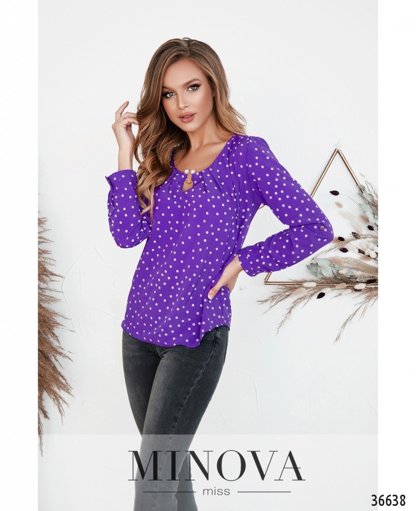 Лёгкая, воздушная, очень нарядная блуза на каждый день или на праздник – в зависимости от того, какой оттенок или принт ты выберешь. В каталоге Minova представлены модели в принт «шестиугольник», в горошек и однотонные. Цвета – пастельные, яркие или классические. Блуза без застёжек и карманов, рукава полной длины, с небольшими манжетами, на манжетах – по одной пуговке. Регулируются на пуговку и ленту. Вырез горловины полукруглый, неглубокий, спереди ткань присобрана и закреплена очаровательной металлической «брошкой» с «жемчужными» наконечниками. Блуза свободного кроя, её лучше носить навыпуск.