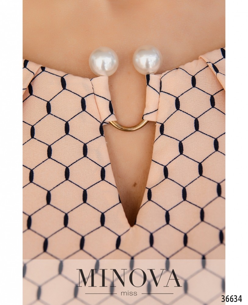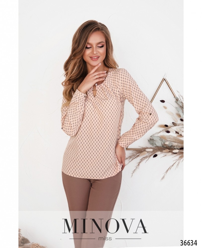 Лёгкая, воздушная, очень нарядная блуза на каждый день или на праздник – в зависимости от того, какой оттенок или принт ты выберешь. В каталоге Minova представлены модели в принт «шестиугольник», в горошек и однотонные. Цвета – пастельные, яркие или классические. Блуза без застёжек и карманов, рукава полной длины, с небольшими манжетами, на манжетах – по одной пуговке. Регулируются на пуговку и ленту. Вырез горловины полукруглый, неглубокий, спереди ткань присобрана и закреплена очаровательной металлической «брошкой» с «жемчужными» наконечниками. Блуза свободного кроя, её лучше носить навыпуск.