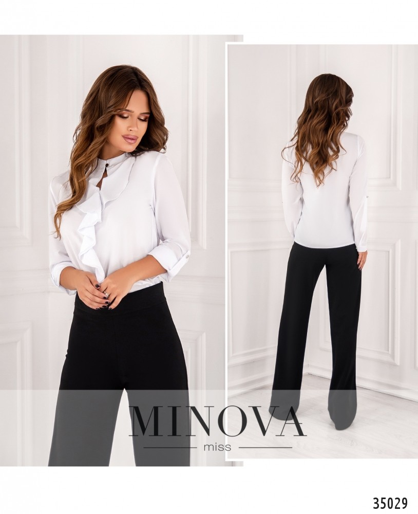 Нежная и стильная блуза с жабо из нового пополнения женской одежды от Minova отлично подойдёт для создания как делового, так и неформального гардероба благодаря разнообразию расцветок – белая, тёмная, зелёная, жёлтая и красная, на любой вкус! Блуза из очень лёгкой ткани, А-силуэта. Рукава полной длины, с манжетами, регулируются на пуговку и ленту. Воротник – небольшая стоечка, застёгивается на пуговку и петельку. Карманов нет. Блузу свободного кроя рекомендуется носить навыпуск с джинсами или брюками, а если сочетаете с юбкой, то лучше заправлять. Однотонная расцветка даёт возожность выбирать подходящие по цвету аксессуары.