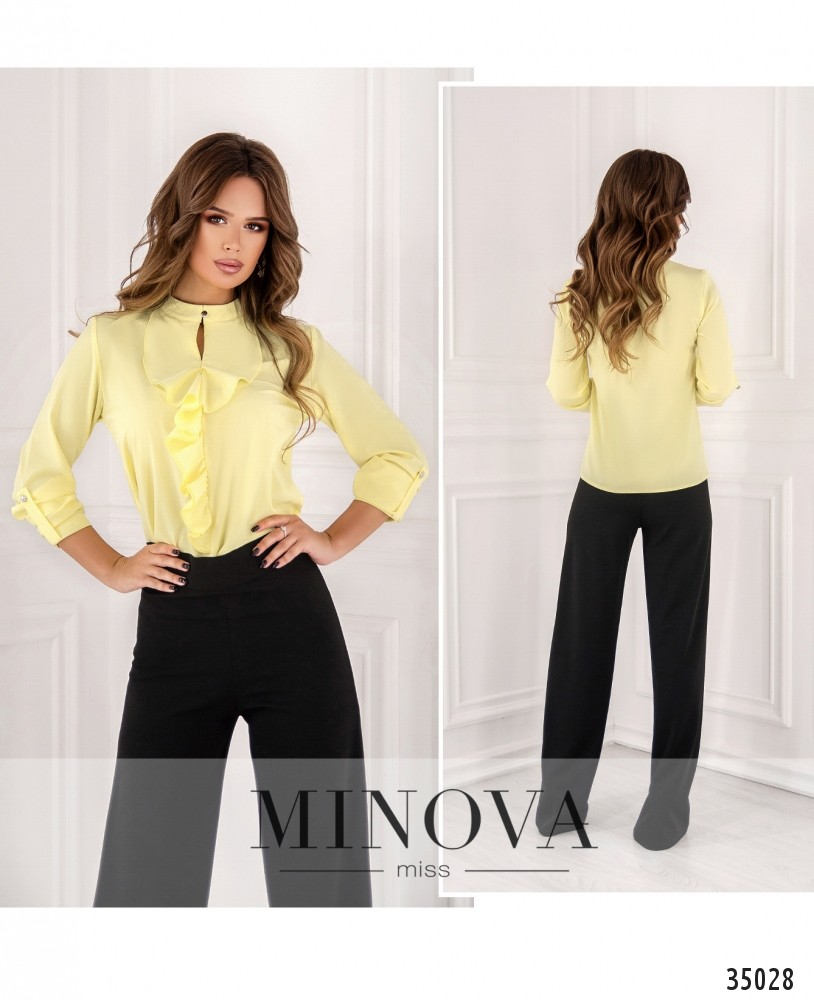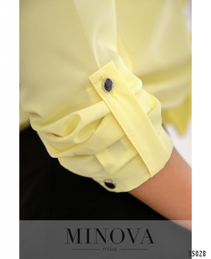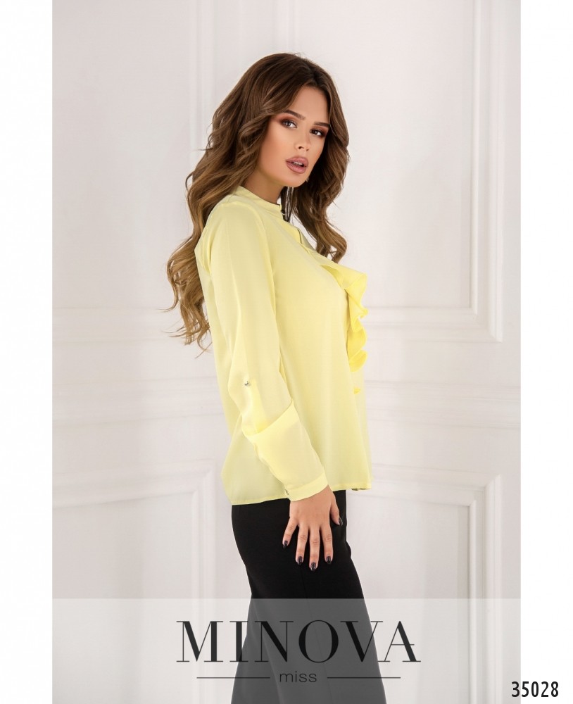 Нежная и стильная блуза с жабо из нового пополнения женской одежды от Minova отлично подойдёт для создания как делового, так и неформального гардероба благодаря разнообразию расцветок – белая, тёмная, зелёная, жёлтая и красная, на любой вкус! Блуза из очень лёгкой ткани, А-силуэта. Рукава полной длины, с манжетами, регулируются на пуговку и ленту. Воротник – небольшая стоечка, застёгивается на пуговку и петельку. Карманов нет. Блузу свободного кроя рекомендуется носить навыпуск с джинсами или брюками, а если сочетаете с юбкой, то лучше заправлять. Однотонная расцветка даёт возожность выбирать подходящие по цвету аксессуары.