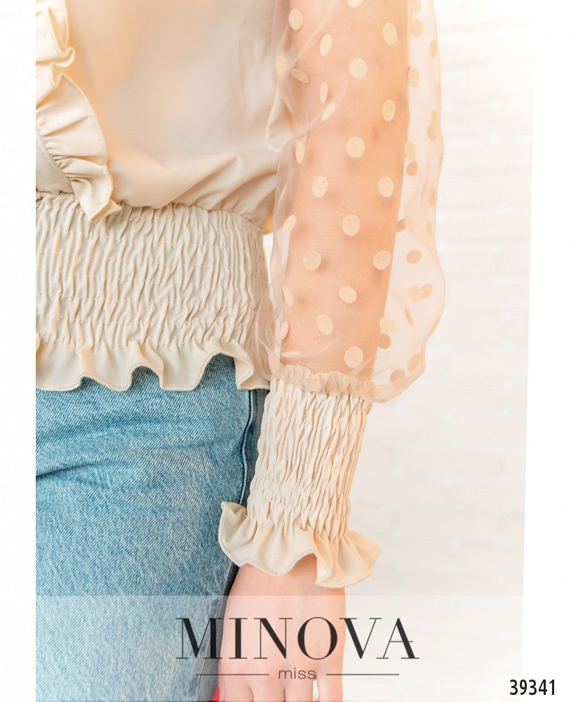 Женственная, изящная, оригинальная блуза, подшитая на запАх. Декольте оторочено аккуратными оборками, а пояс и манжеты присобраны волнистой резинкой, создающей изящные очертания. Рукава из прозрачной сеточки с горошком. Карманов и застёжек нет.