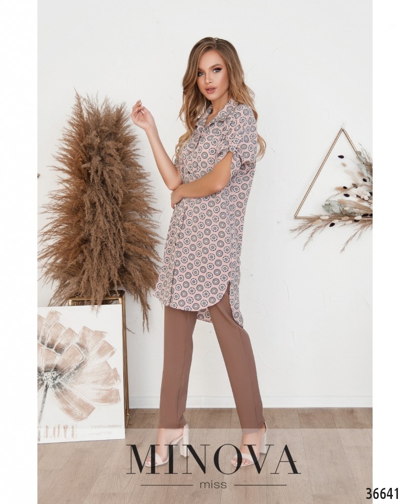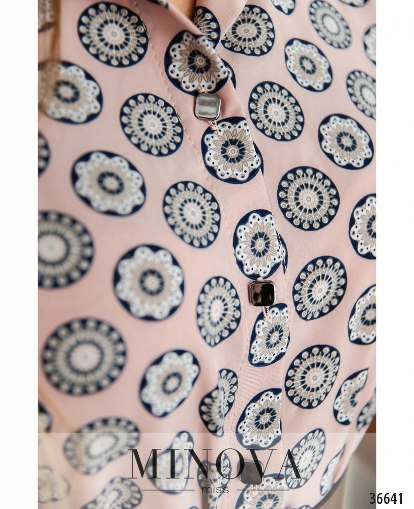 Лёгкая, свободная блузка, которую вполне можно назвать и туникой, и платьем – в новой коллекции женской одежды от Minova. Блузка из приятной ткани пастельного отенка с неброским цветочным принтом, который издалека выглядит как крупный горошек. Воротничок отложной, застёгивается на полный ряд пуговиц от воротника до подола. Подол немного асимметричный: сзади чуть длиннее, по бокам – небольшие разрезы. Рукава длиной 3/4, без манжет, их можно отрегулировать до совсем коротких с помощью пуговки и ленты. Карманы отсутствуют. Прекрасный повседневный вариант, можно носить как самостоятельный элемент или в сочетании с джинсами или леггинсами.