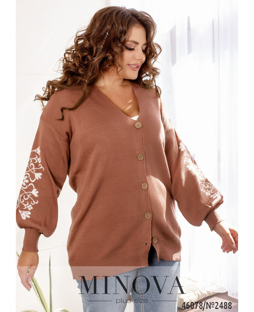 Уютная женственная кофта-кардиган отличается удобством и практичностью. Модель застегивается на ряд пуговиц спереди на планке, а ее изюминкой являются длинные рукава с приспущенной линией плеч, украшенные стильным узором в этническом стиле.