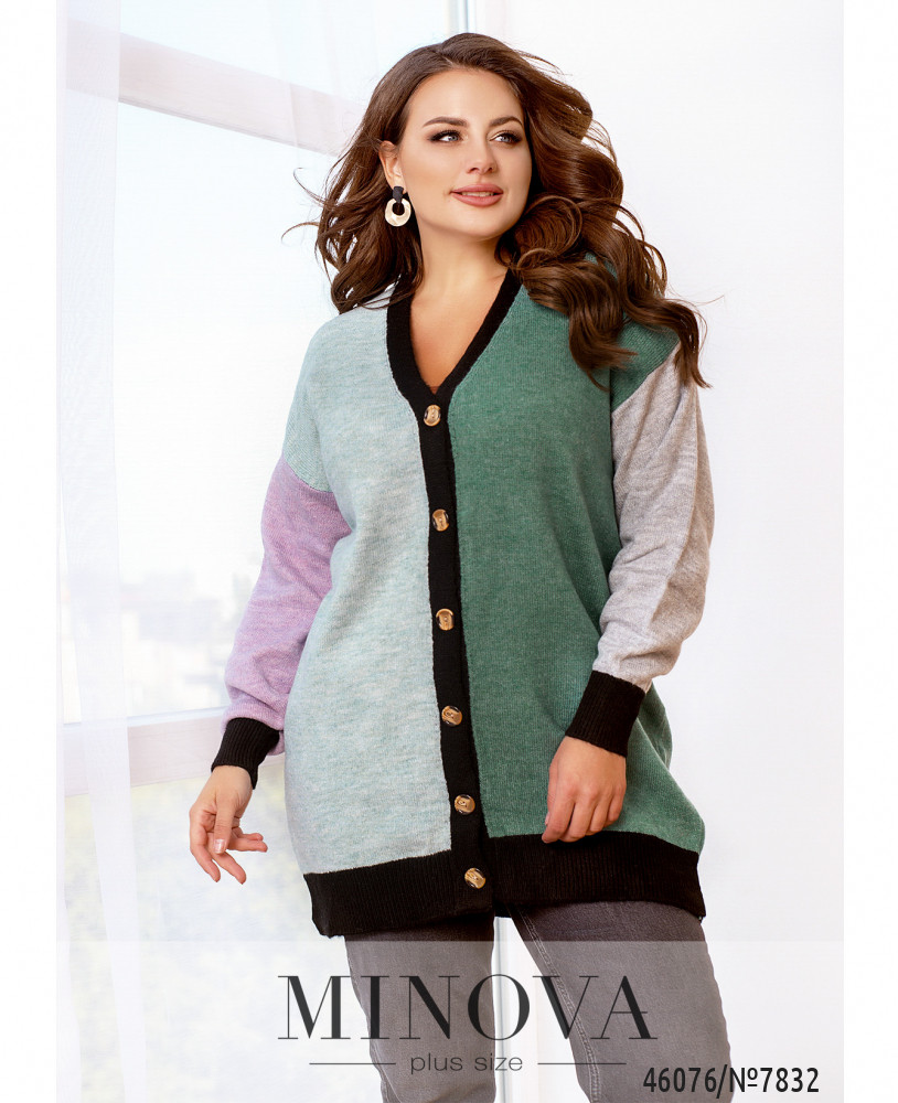 Эта вязаная кофта-кардиган с длинными рукавами с приспущенной линией плеч - универсальная и удобная вещь, которая согреет в прохладный день и создаст актуальный образ в прохладные дни. Она обращает на себя внимание прежде всего за счет своей контрастной расцветки, делающей акцент на передней части кофты. Спинка в данной модели лаконичная и однотонная.