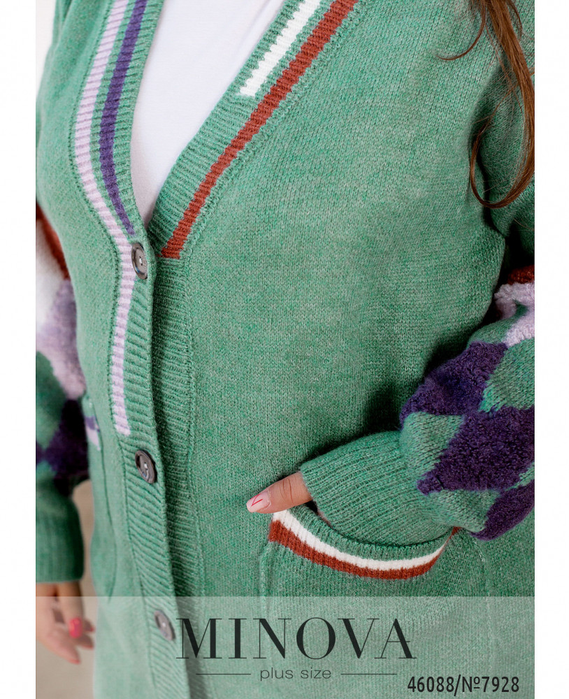 Вязаная кофта-кардиган с накладными карманами станет универсальной для вас, ведь с ней можно создавать действительно стильные и яркие образы. Изюминкой данной модели безусловной являются рукава, украшенные ярким геометрическим орнаментом.