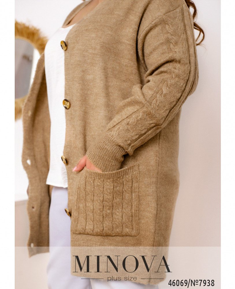 Эта мягкая вязанная кофта-кардиган привлечет внимание любительниц минимализма. Однотонная лаконичная модель выглядит выразительно за счет узоров на рукавах с приспущенной линией плеч и на накладных карманах, пришитых по бокам. Эта модель станет хорошим дополнением вашего базового гардероба.