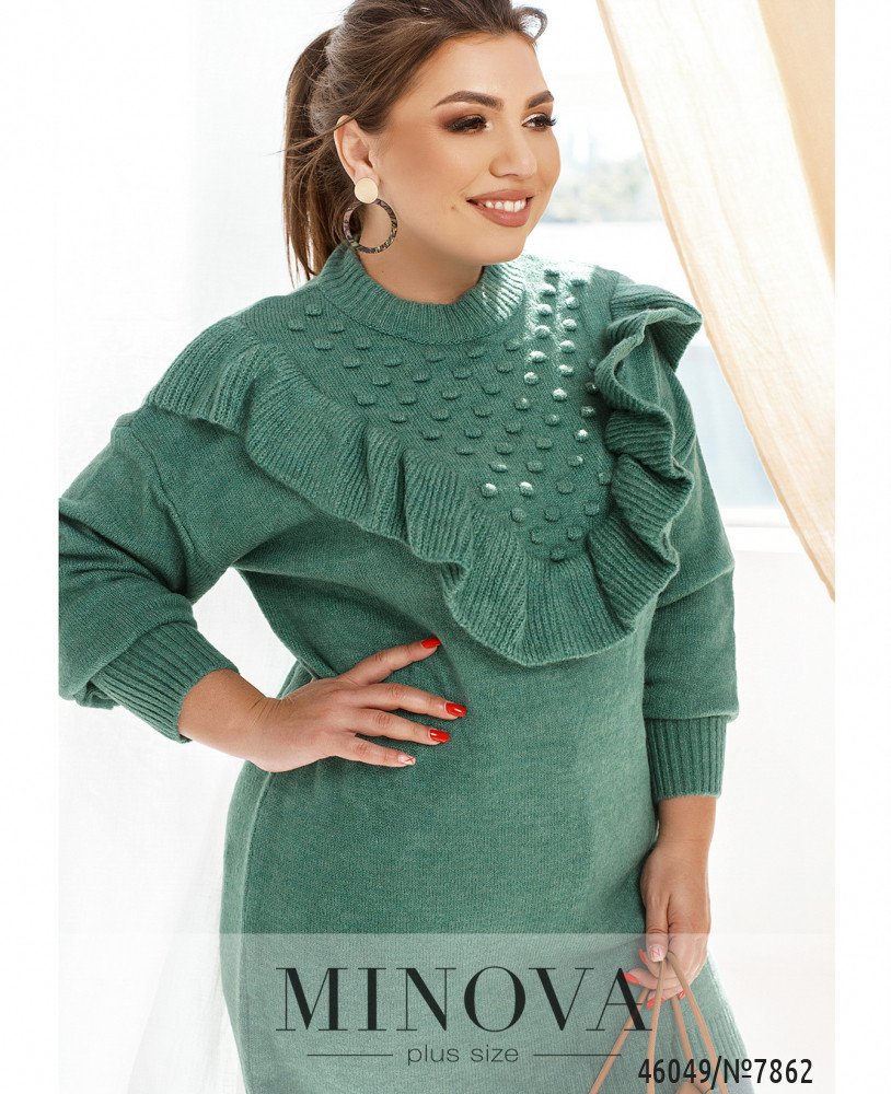 Женственный удлиненный свитер-туника привлекает внимание необычной фактурой и удобством. Модель с нежными вязаными оборками спереди груди поможет создать нежный образ в романтическом стиле.