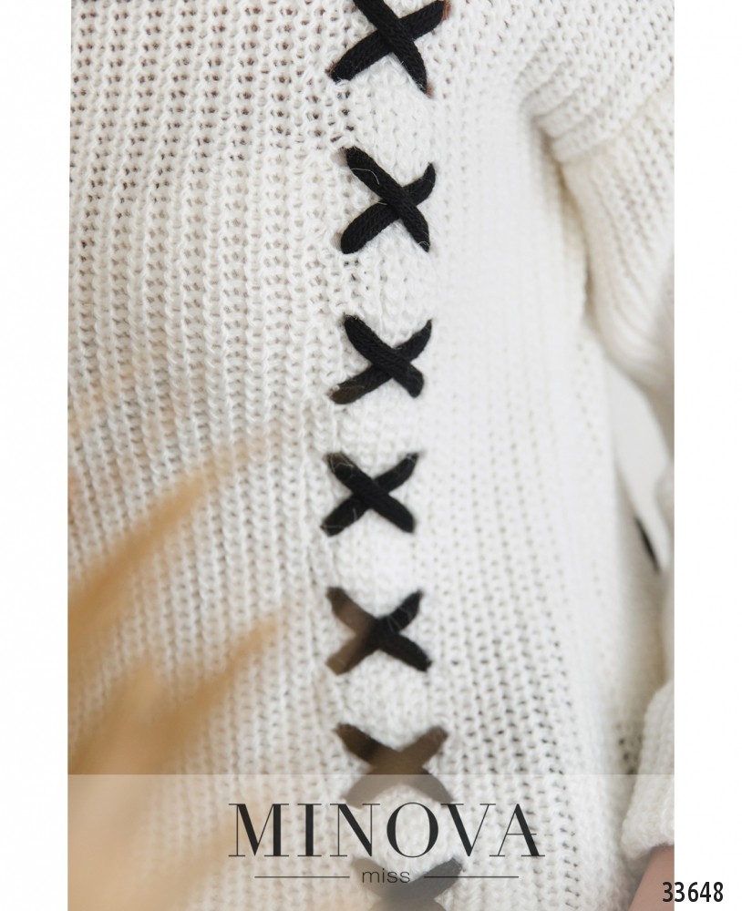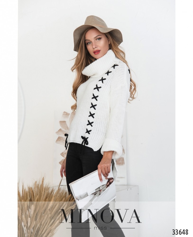 Не бойтесь экспериментировать с образами! Вязаный свитер в глубоких оттенках добавит настроения в привычный нейтральный гардероб. А эффектные детали в виде контрастной шнуровки и расклешенные рукава-колокола подчеркнут креативность Вашей натуры. Рукава подворачиваются в широкие манжеты. Широкий воротник-гольф и удлиненный на спине подол с разрезами дополнительно защищают от неуютного осеннего ветра.