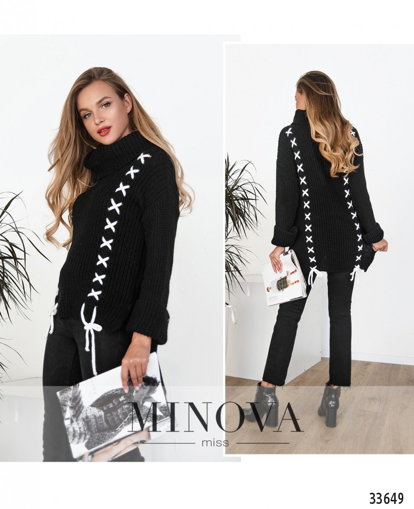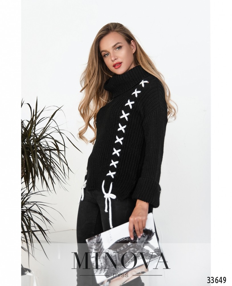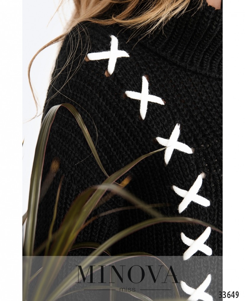 Не бойтесь экспериментировать с образами! Вязаный свитер в глубоких оттенках добавит настроения в привычный нейтральный гардероб. А эффектные детали в виде контрастной шнуровки и расклешенные рукава-колокола подчеркнут креативность Вашей натуры. Рукава подворачиваются в широкие манжеты. Широкий воротник-гольф и удлиненный на спине подол с разрезами дополнительно защищают от неуютного осеннего ветра.