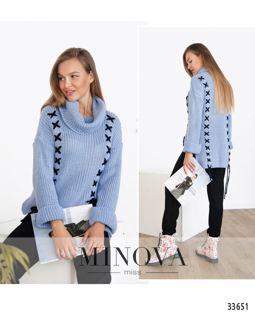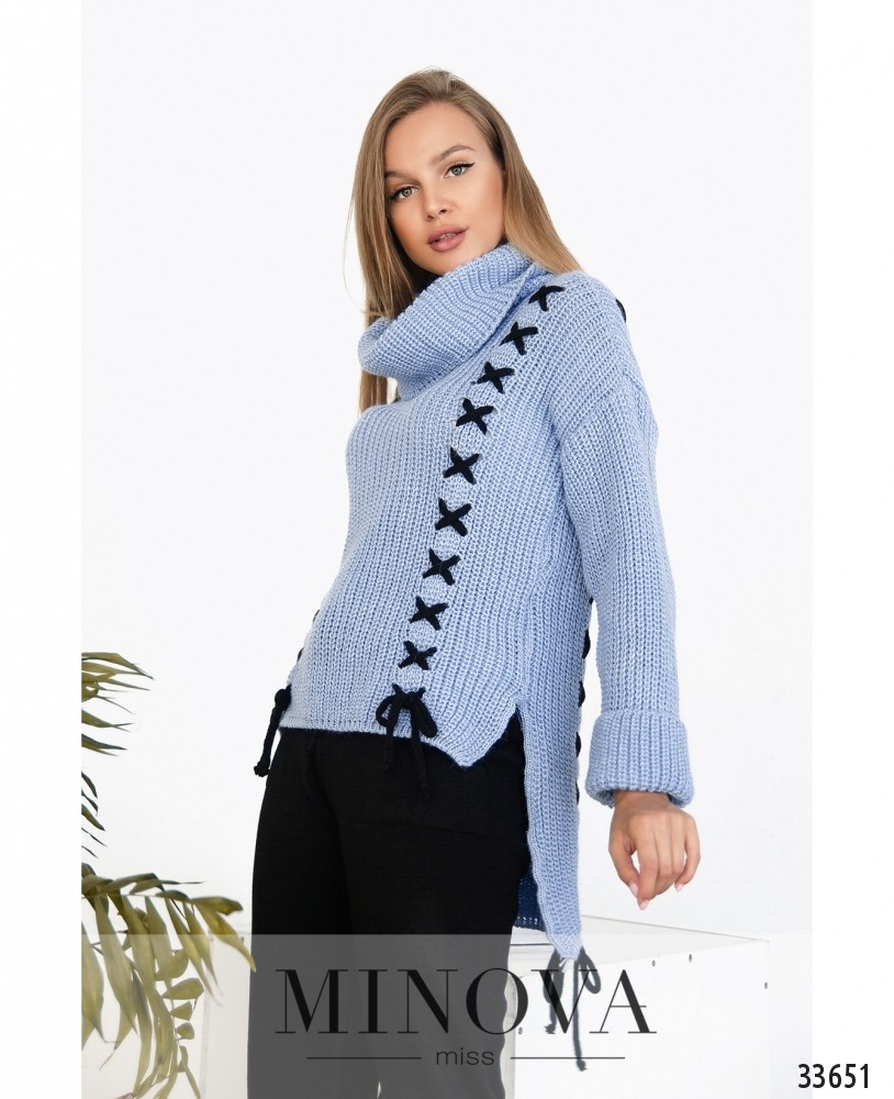 Не бойтесь экспериментировать с образами! Вязаный свитер в глубоких оттенках добавит настроения в привычный нейтральный гардероб. А эффектные детали в виде контрастной шнуровки и расклешенные рукава-колокола подчеркнут креативность Вашей натуры. Рукава подворачиваются в широкие манжеты. Широкий воротник-гольф и удлиненный на спине подол с разрезами дополнительно защищают от неуютного осеннего ветра.