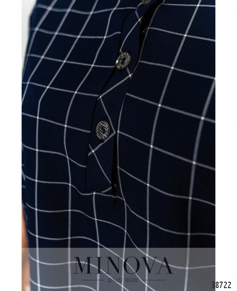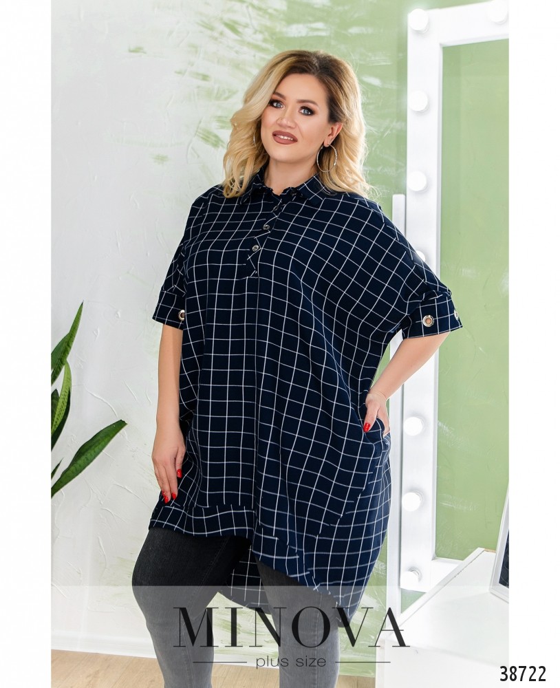 Лёгкая и удобная туника батал в клеточку, с отложным воротничком и рядом пуговиц на планке до середины груди. На рукавах - декоративные отверстия с люверсами на манжетах. Сзади на спинке - кокетка. По бокам - врезные карманы. Подол асимметричный благодаря декоративным швам.