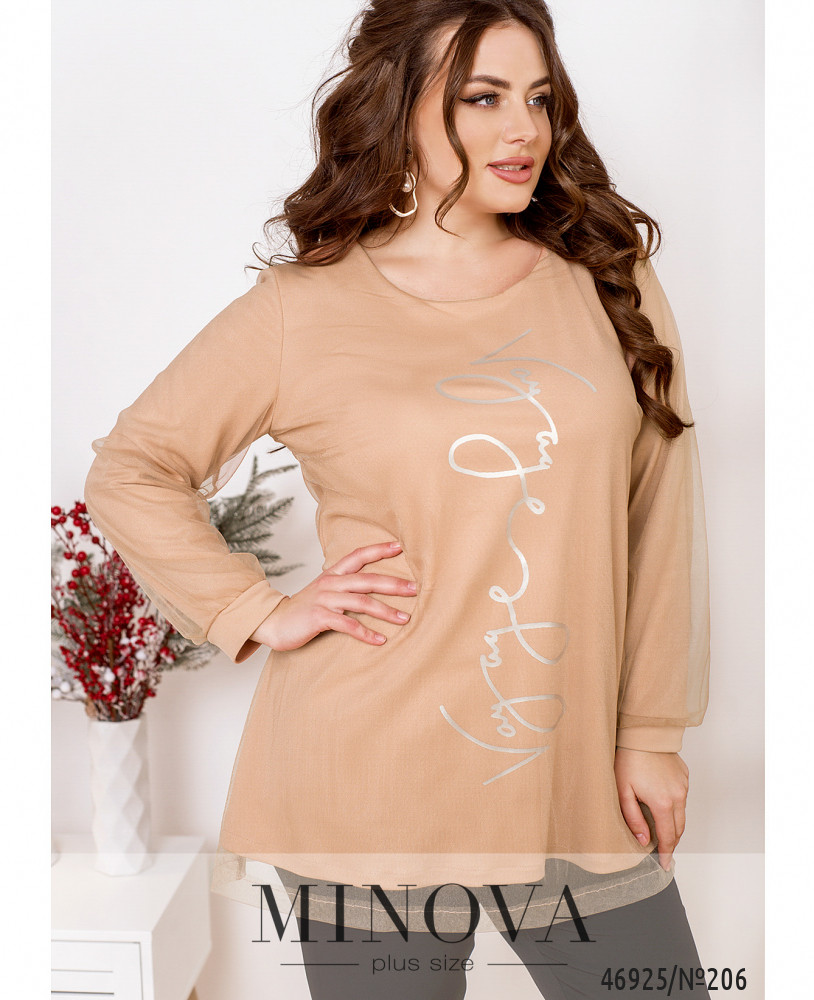 Воздушная нарядная туника хорошо садятся по фигуре, вне зависимости от ее особенностей. Двуслойная модель лаконичного кроя дополнена длинными рукавами с манжетами и ярким принтом спереди.