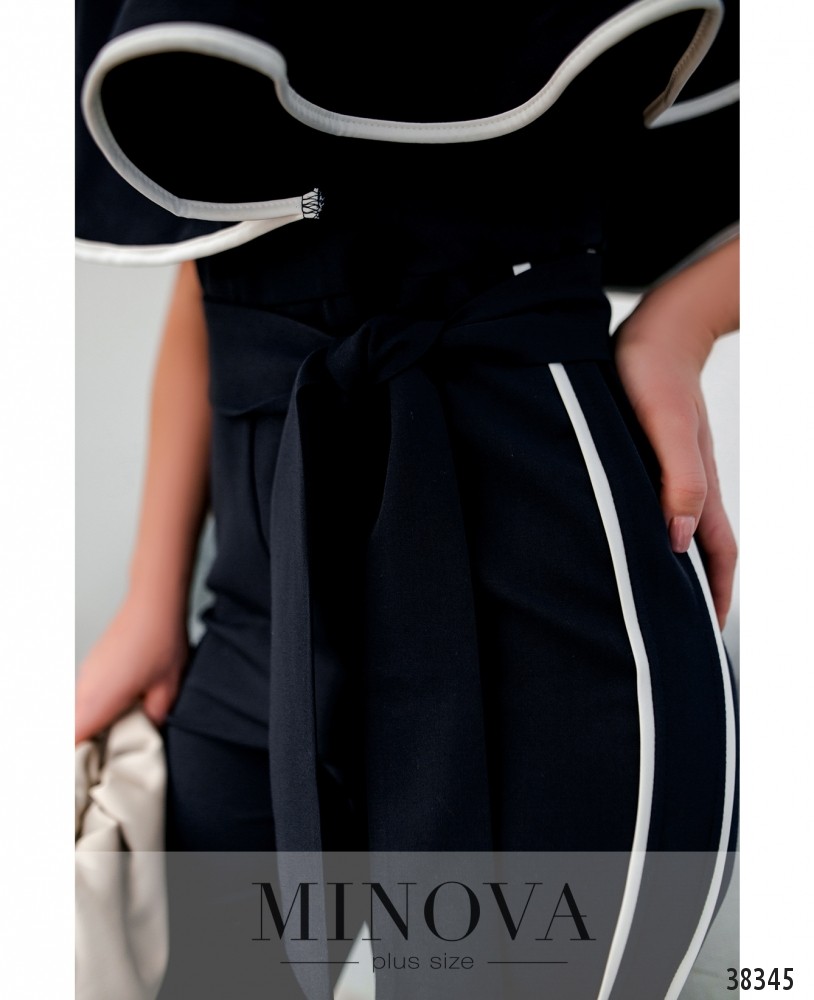 Очень женственный комбинезон с мягкими оборками, ниспадающими с плеч до талии и выполняющими роль рукавов. Оборки оторочены контрастной белой лентой, и такие же белые ленты – на брюках в качестве лампасов. Карманов нет, в комплекте пояс. Застёгивается на вшитую по спинке змейку. Вырез декольте широкий, глубокий.