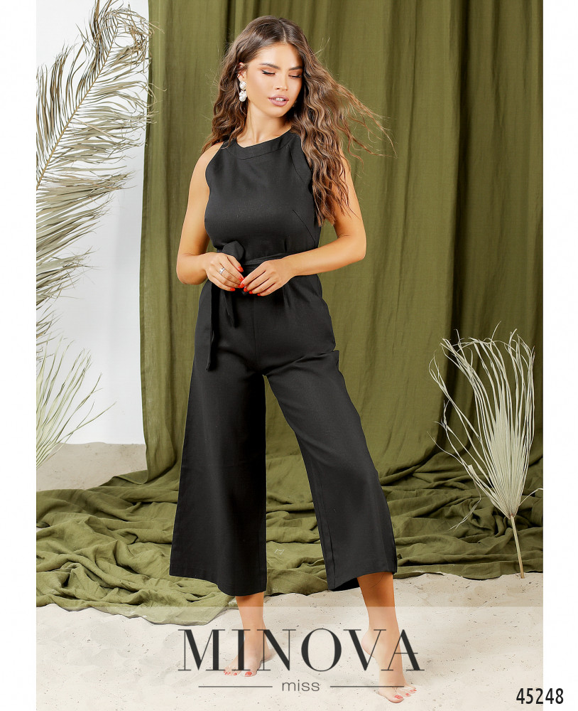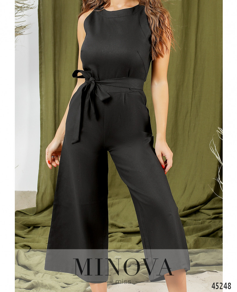 Минималистичный и очень привлекательный комбинезон с закрытым передом и спинкой, без рукавов, по бокам - врезные карманы, застёгивается на вшитую по спинке молнию. Брюки расклешённые. На груди - скульптурирующие вытачки.