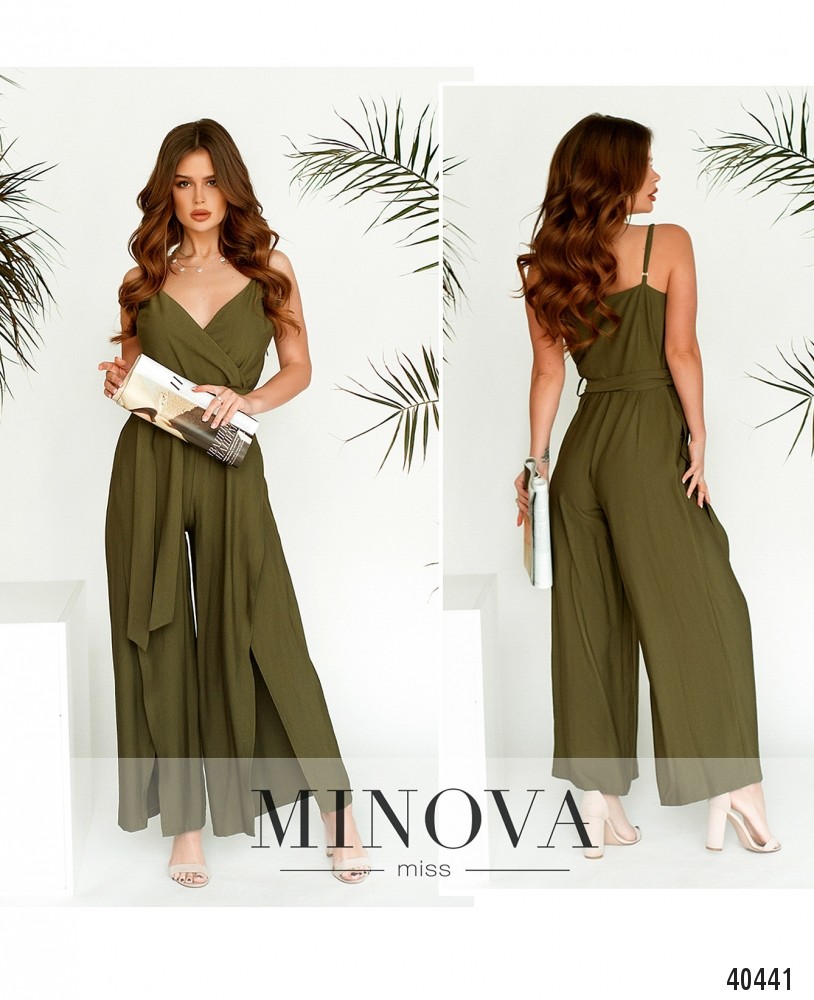 Элегантный комбинезон с подшитым на запАх верхом, застёгивается на молнию слева подмышкой. Бретели спереди широкие, по спине тонкие, с регулировкой. Брюки расклешены за счёт оригинальных вставок по бокам. В комплекте пояс. На груди вытачки.