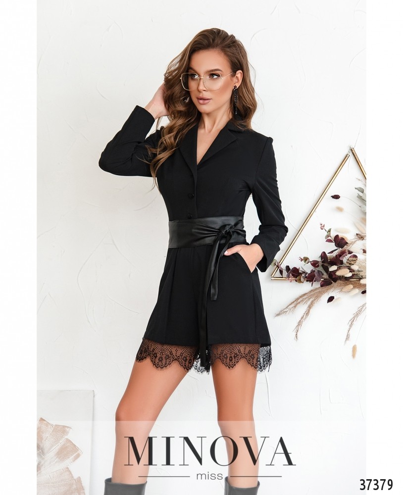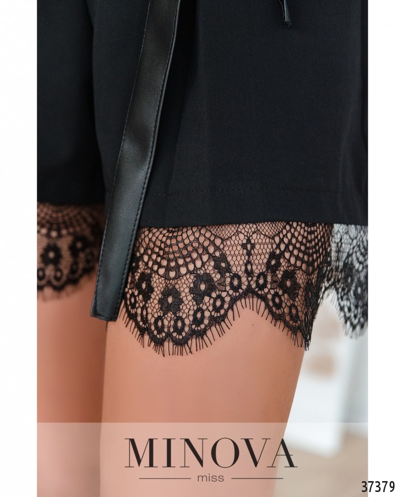 Лёгкий повседневный комбинезон с короткими шортами-юбкой. Верх в стиле пиджака, с тремя пуговицами и небольшими лацканами. Рукава без манжет. Подкладки нет. Шорты украшены снизу кружевом. На талии – ширинка со змейкой. По бокам – прорезные карманы. В комплекте – широкий пояс.