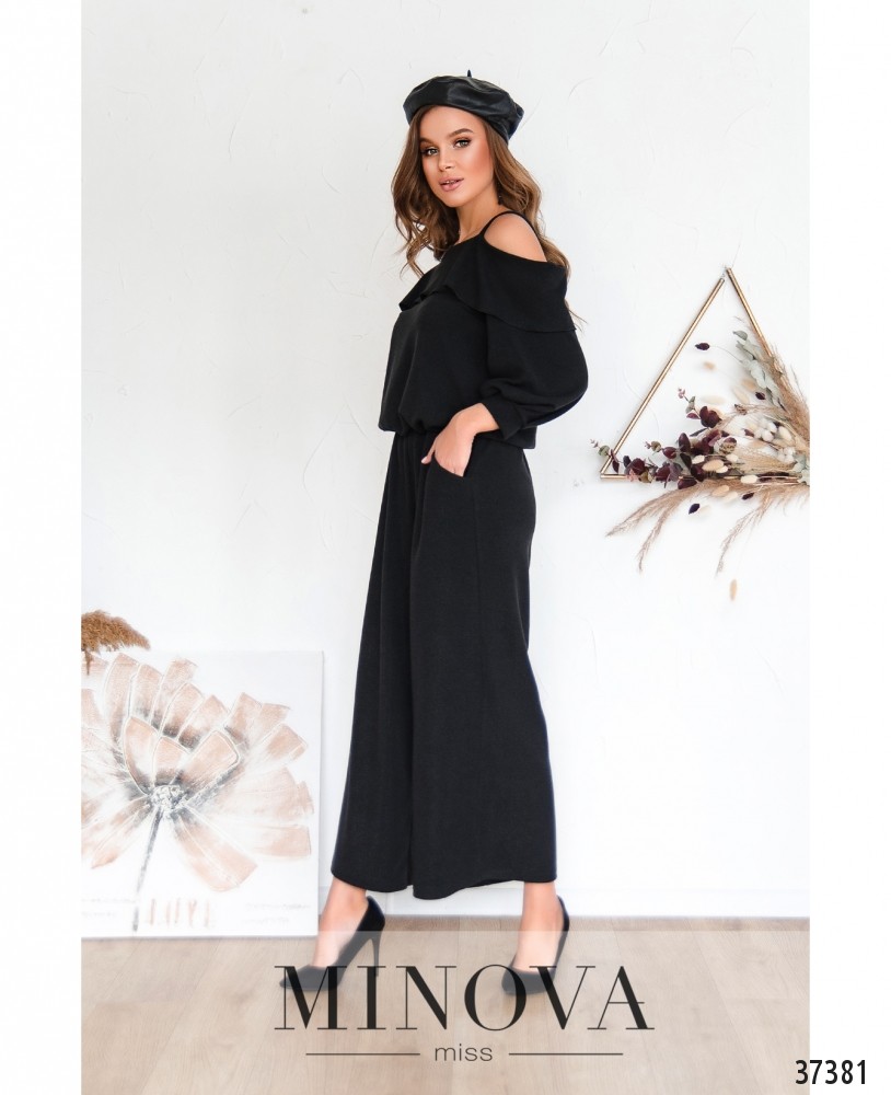 Романтичный комбинезон с широкими лямками и открытыми плечами. На груди – мягкие оборки. По бокам – врезные карманы. Брюки расклешены от бедра. Рукава с мягкими манжетами без пуговиц. Ткань мягкая, плотная, с люрексом.