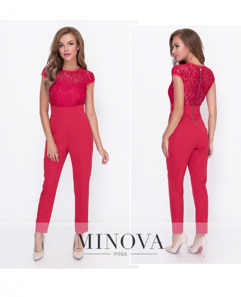 Женственный комбинезон с кружевным лифом и завышенной отрезной талией. Лиф с короткими рукавами изготовлен из кружева с подкладкой на лицевой стороне. Штанины дополнены карманами. На спинке комбинезон застегивается с помощью фактурной молнии.