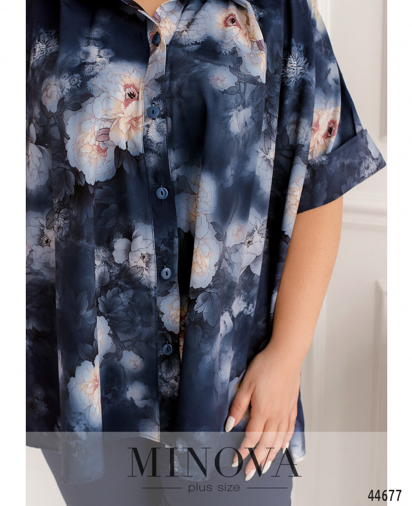 Стильный костюм батал, рубашка с отложным воротничком, рукава короткие, с манжетами. Застёжка - ряд пуговиц спереди на планке. Карманов нет. Брюки со вшитой в пояс резинкой, по бокам - карманы в шве, посадка высокая, застёжек нет.