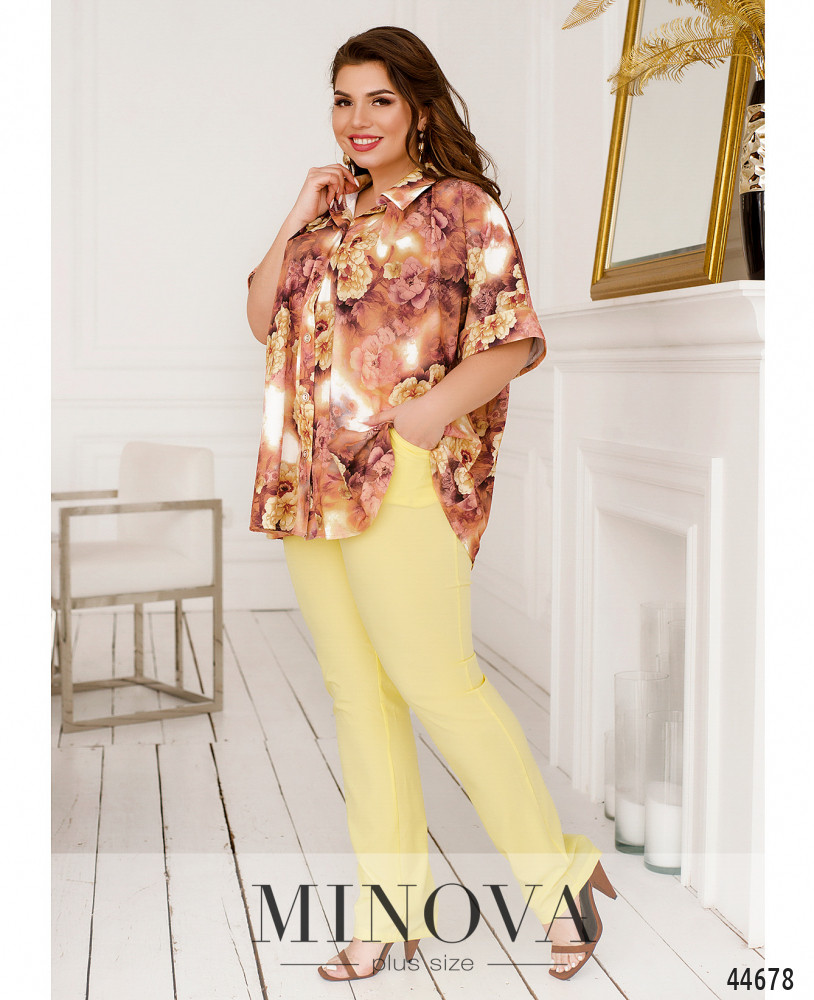 Стильный костюм батал, рубашка с отложным воротничком, рукава короткие, с манжетами. Застёжка - ряд пуговиц спереди на планке. Карманов нет. Брюки со вшитой в пояс резинкой, по бокам - карманы в шве, посадка высокая, застёжек нет.