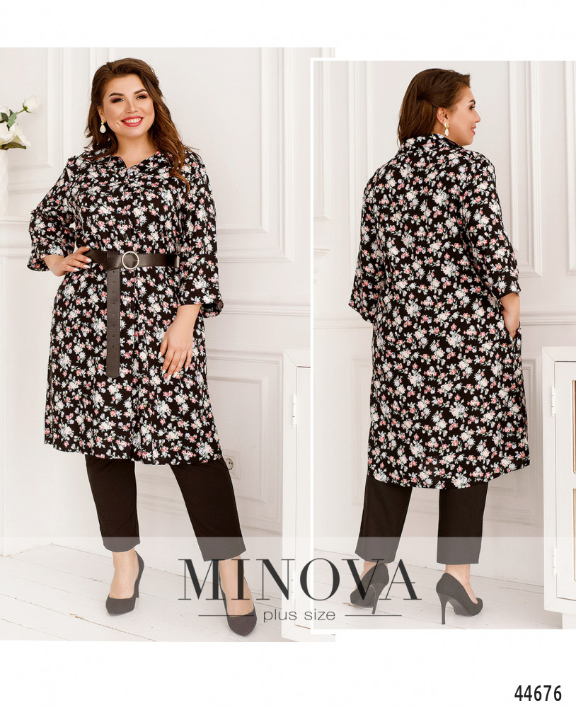 Элегантный костюм батал, рубашка длинная, рукава с мягкими манжетами, по бокам - карманы в шве, застёгивается на ряд пуговиц от отложного воротничка до низу. Брюки без застёжек, по бокам карманы в шве, посадка высокая, в пояс вшита резинка. Пояс/аксессуар входит в комплект.