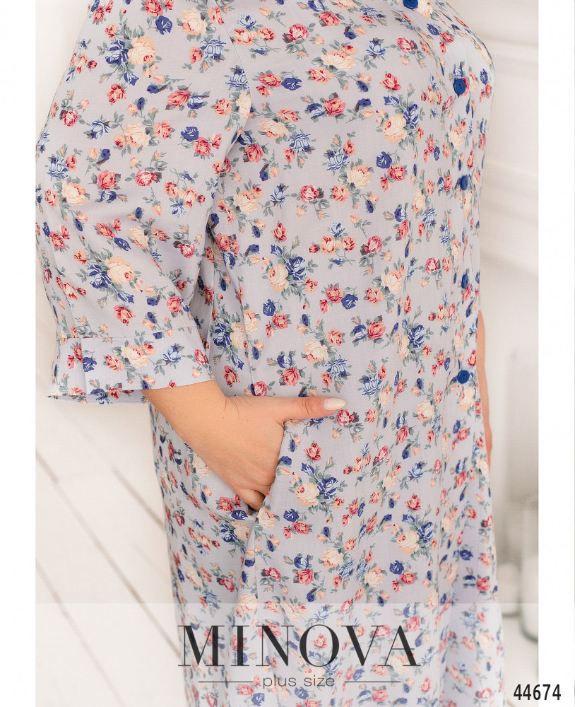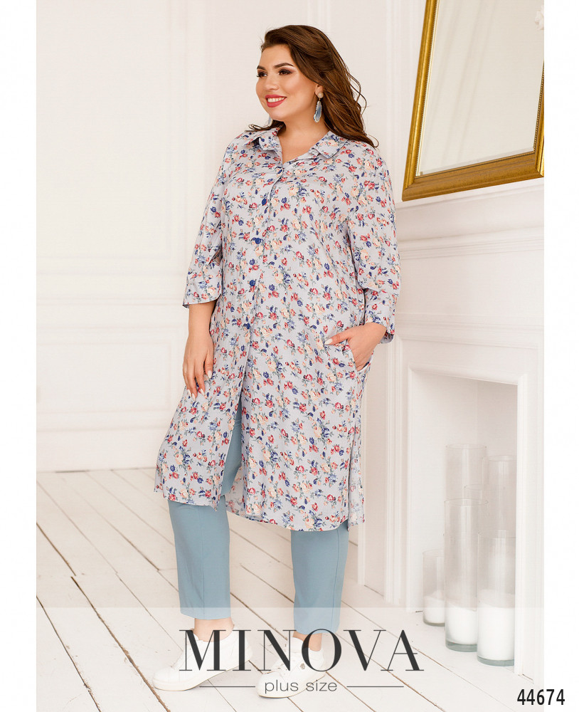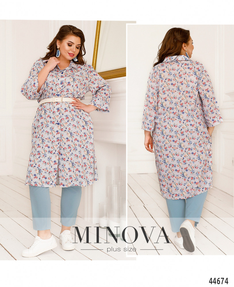 Элегантный костюм батал, рубашка длинная, рукава с мягкими манжетами, по бокам - карманы в шве, застёгивается на ряд пуговиц от отложного воротничка до низу. Брюки без застёжек, по бокам карманы в шве, посадка высокая, в пояс вшита резинка. Пояс/аксессуар входит в комплект.