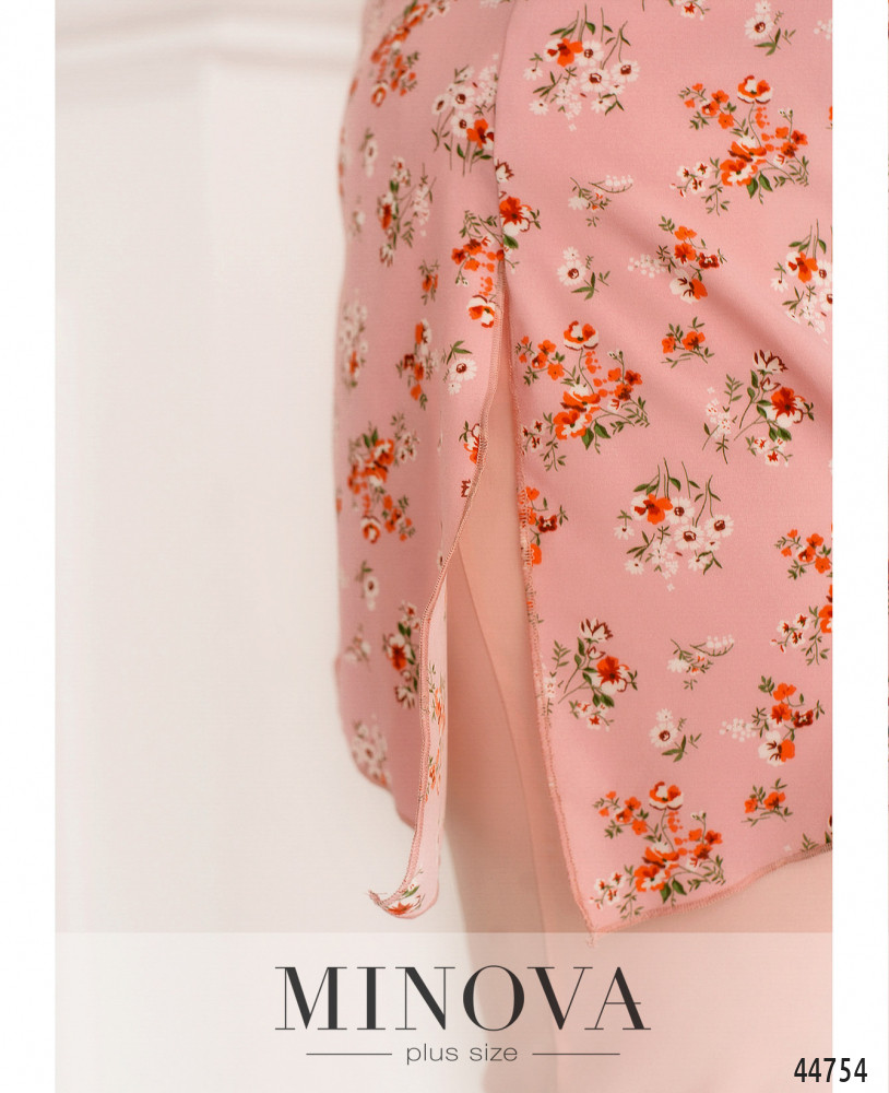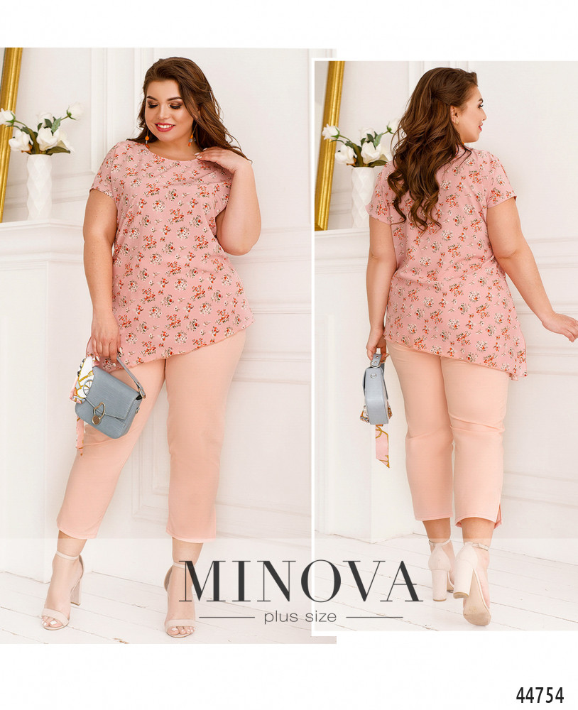 Оригинальный костюм плюс сайз, блуза с асимметричным подолом и ярким принтом, без карманов и застёжек, справа на подоле небольшой разрез. Рукава короткие фасона "летучая мышь". Вырез горловины полукруглый. Брюки с высокой талией, без застёжек, по бокам - карманы в шве, в пояс вшита резинка.