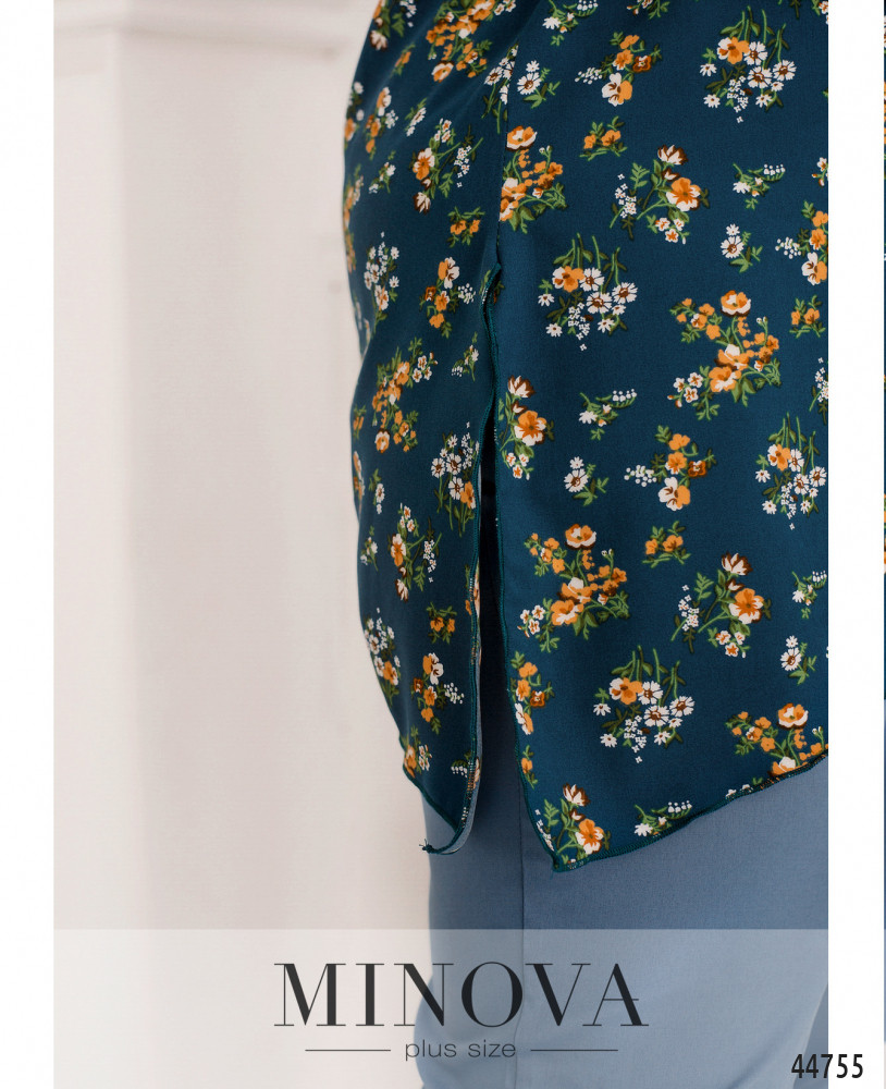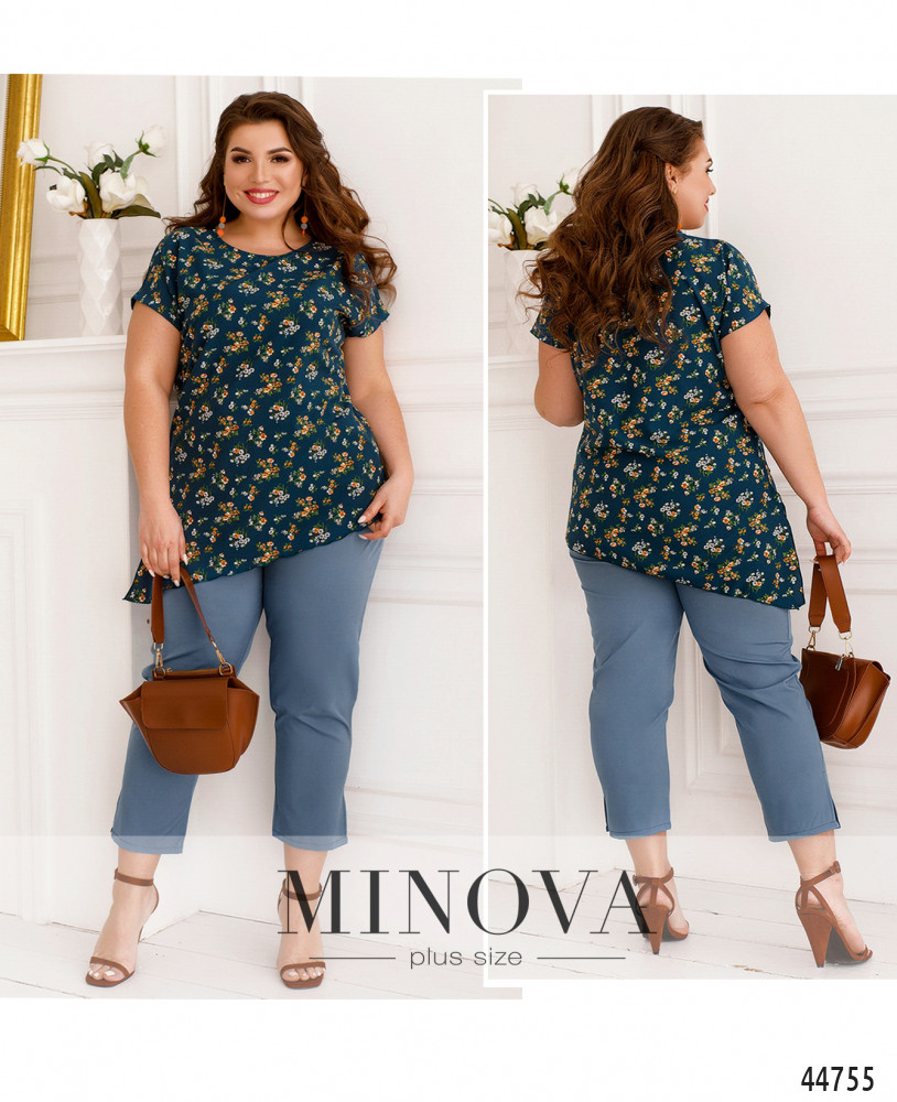 Оригинальный костюм плюс сайз, блуза с асимметричным подолом и ярким принтом, без карманов и застёжек, справа на подоле небольшой разрез. Рукава короткие фасона "летучая мышь". Вырез горловины полукруглый. Брюки с высокой талией, без застёжек, по бокам - карманы в шве, в пояс вшита резинка.