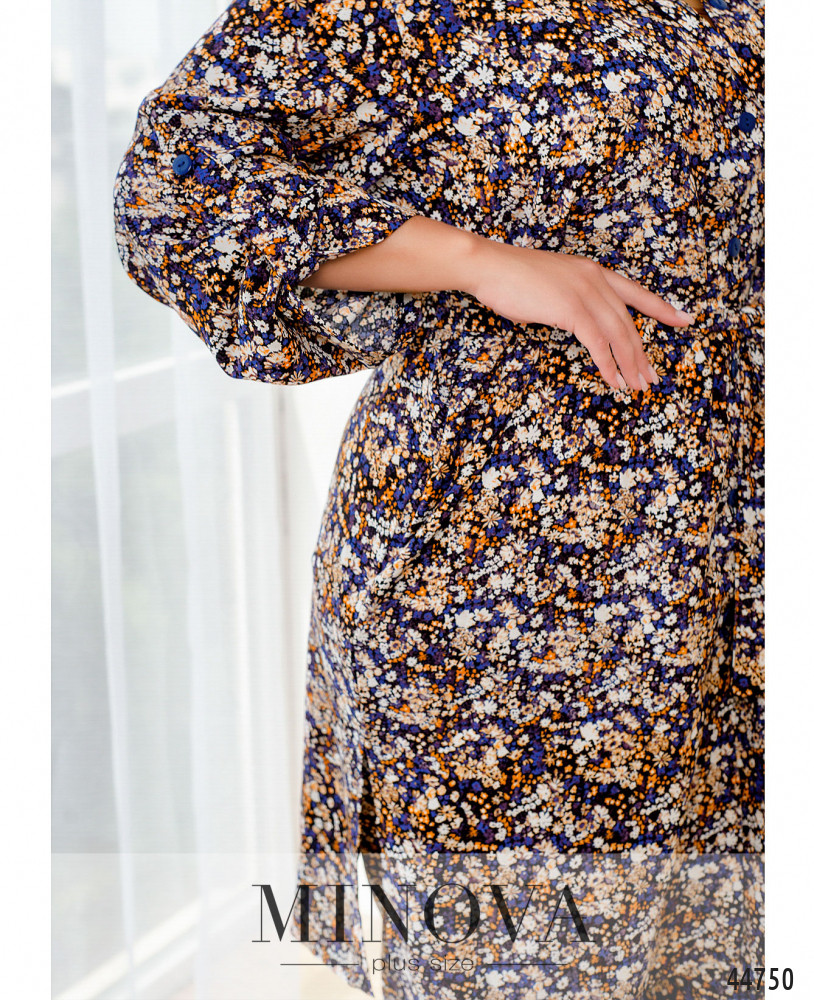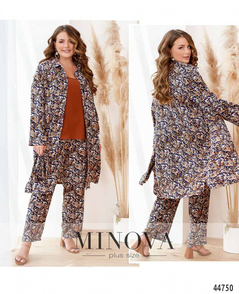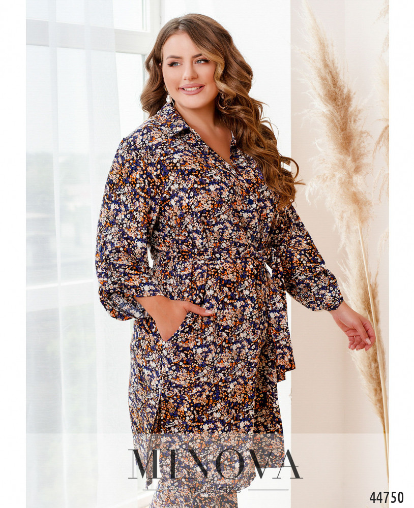 Яркий и привлекательный костюм батал, рубашка длинная, рукава без манжет, с регулировочной лентой, воротничок отложной, застёжка - ряд пуговиц спереди на планке, от воротничка до подола. По бокам - карманы в шве. Брюки с высокой талией и карманами в шве, в пояс вшита резинка, застёжек нет.