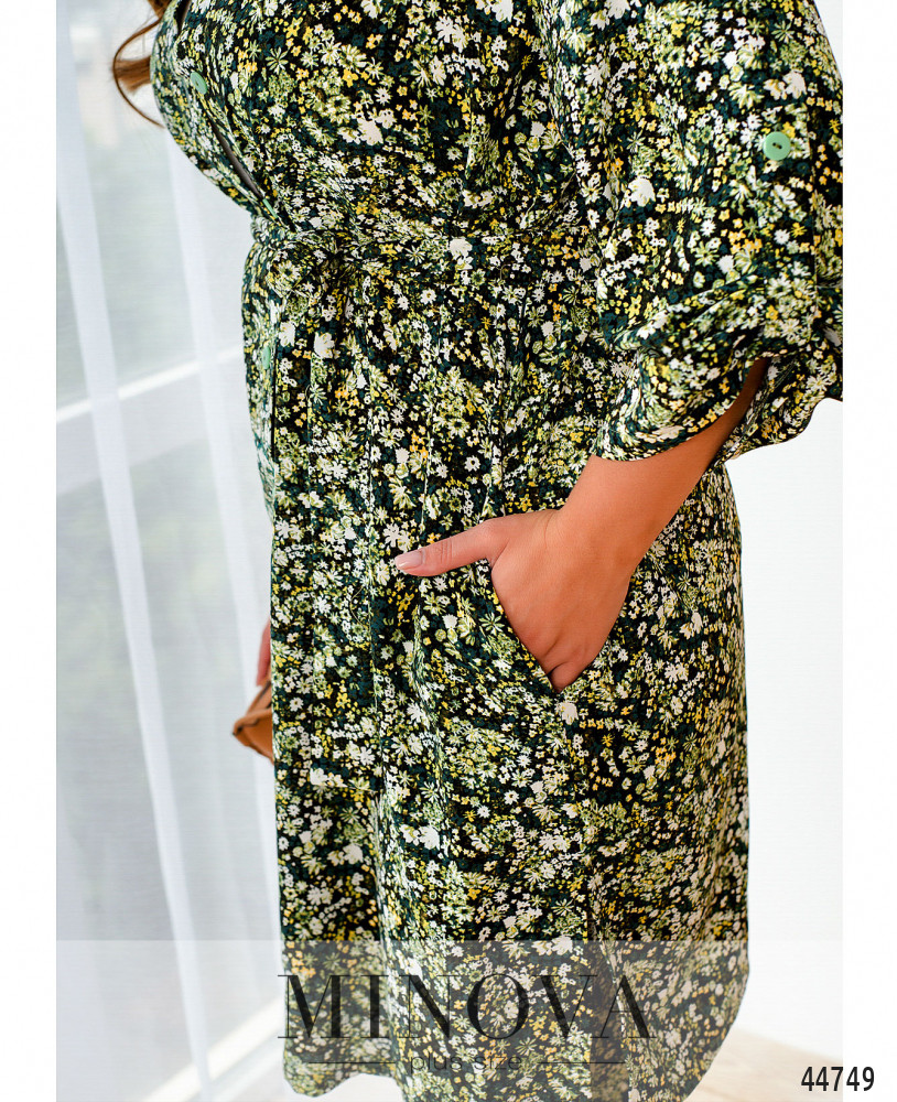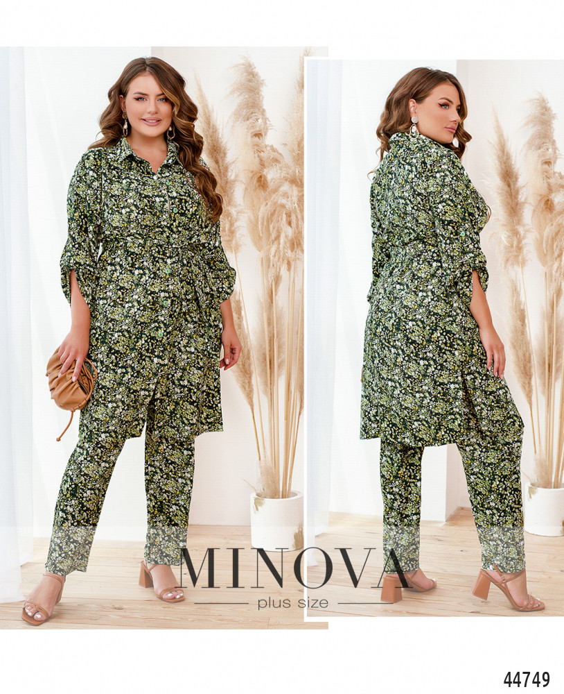 Яркий и привлекательный костюм батал, рубашка длинная, рукава без манжет, с регулировочной лентой, воротничок отложной, застёжка - ряд пуговиц спереди на планке, от воротничка до подола. По бокам - карманы в шве. Брюки с высокой талией и карманами в шве, в пояс вшита резинка, застёжек нет.