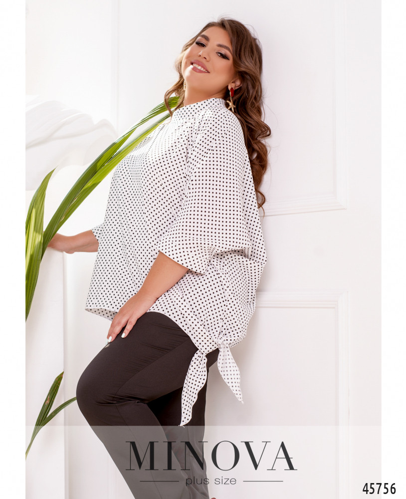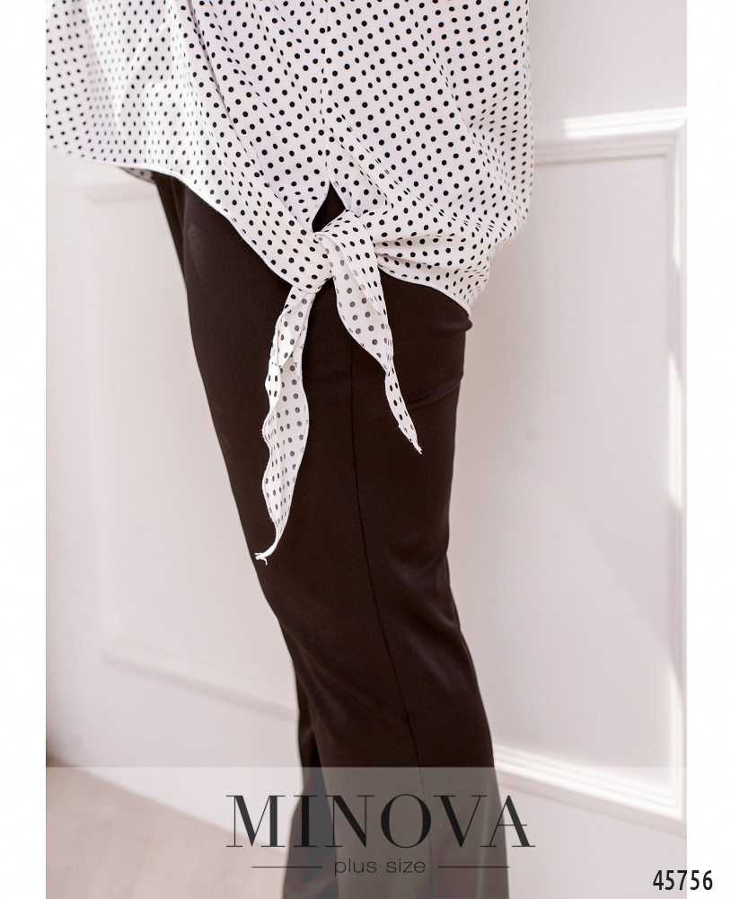 Яркий стильный костюм, состоящий из блузы и брюк, – универсальное решение для любой модницы. Воздушная выразительная блуза с рукавами "летучая мышь" длиной 3/4 и маленьким воротником-стойкой идеально дополнена лаконичными однотонными брюками прямого кроя с карманами и резинкой, вшитой по линии талии.