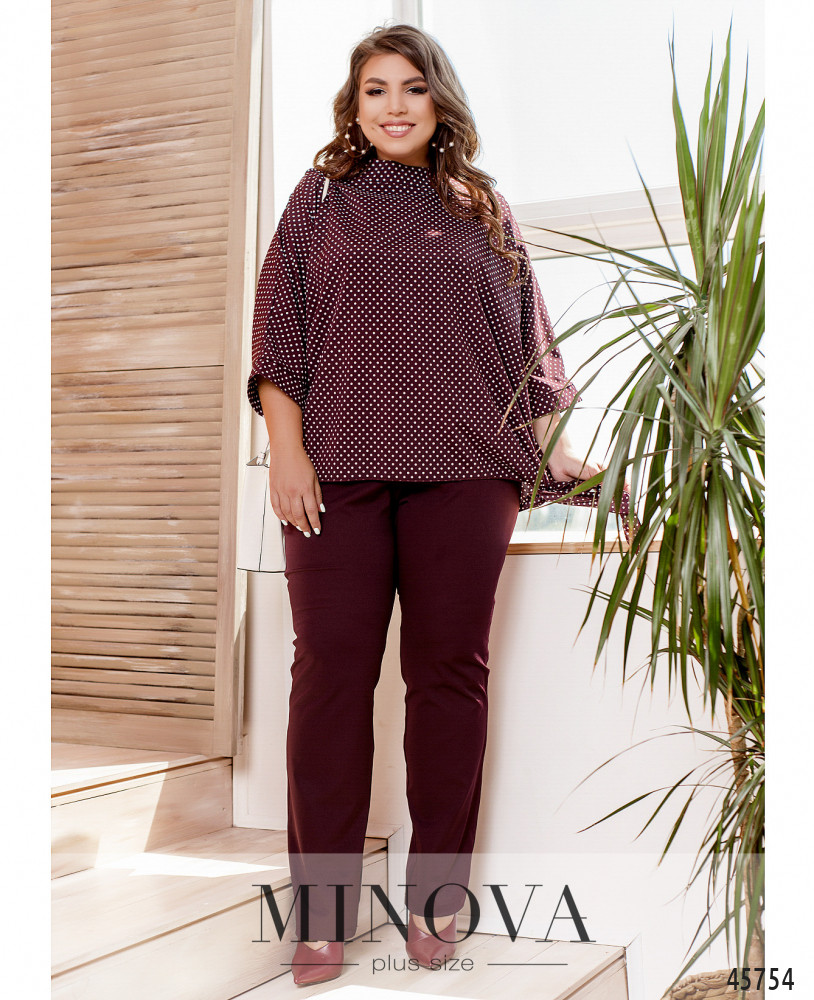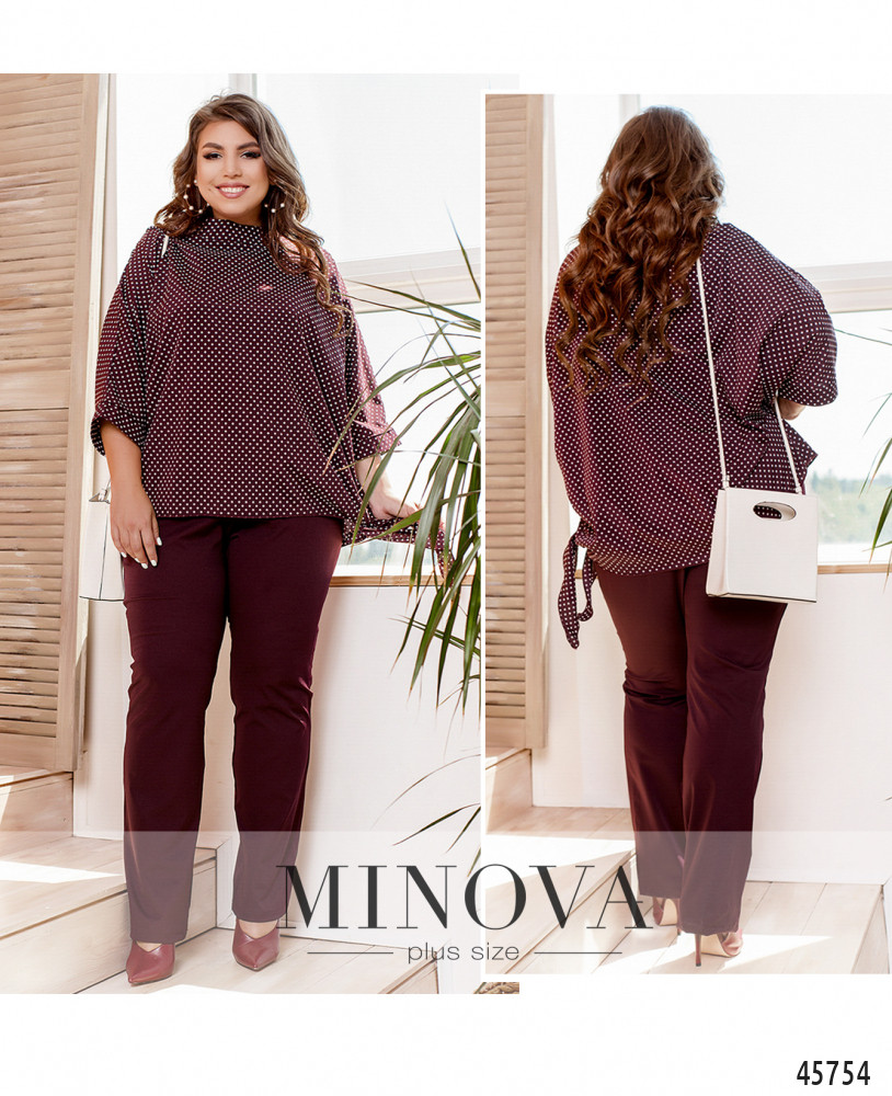 Яркий стильный костюм, состоящий из блузы и брюк, – универсальное решение для любой модницы. Воздушная выразительная блуза с рукавами "летучая мышь" длиной 3/4 и маленьким воротником-стойкой идеально дополнена лаконичными однотонными брюками прямого кроя с карманами и резинкой, вшитой по линии талии.