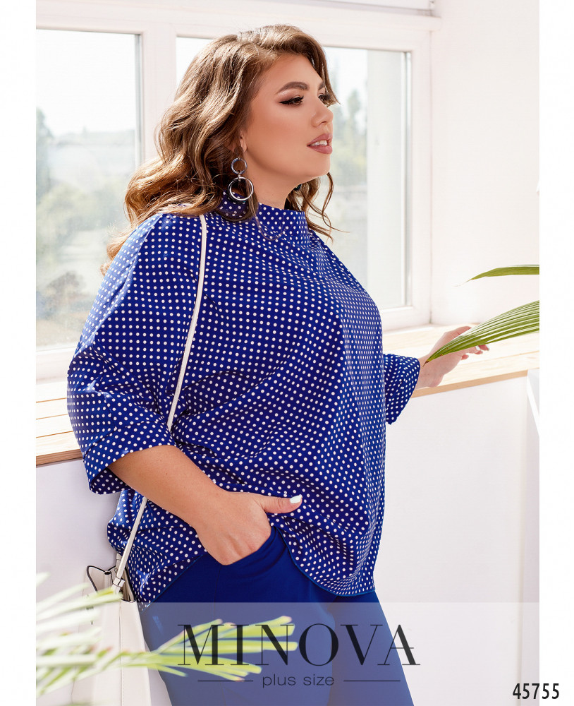 Яркий стильный костюм, состоящий из блузы и брюк, – универсальное решение для любой модницы. Воздушная выразительная блуза с рукавами "летучая мышь" длиной 3/4 и маленьким воротником-стойкой идеально дополнена лаконичными однотонными брюками прямого кроя с карманами и резинкой, вшитой по линии талии.