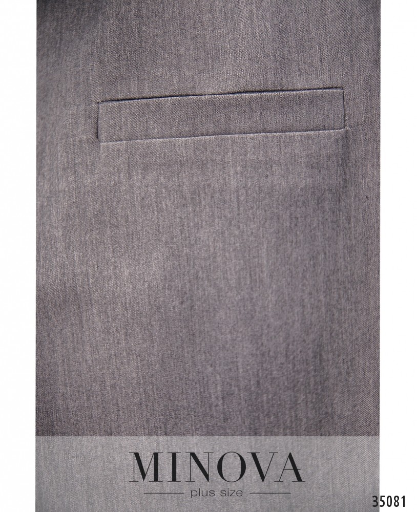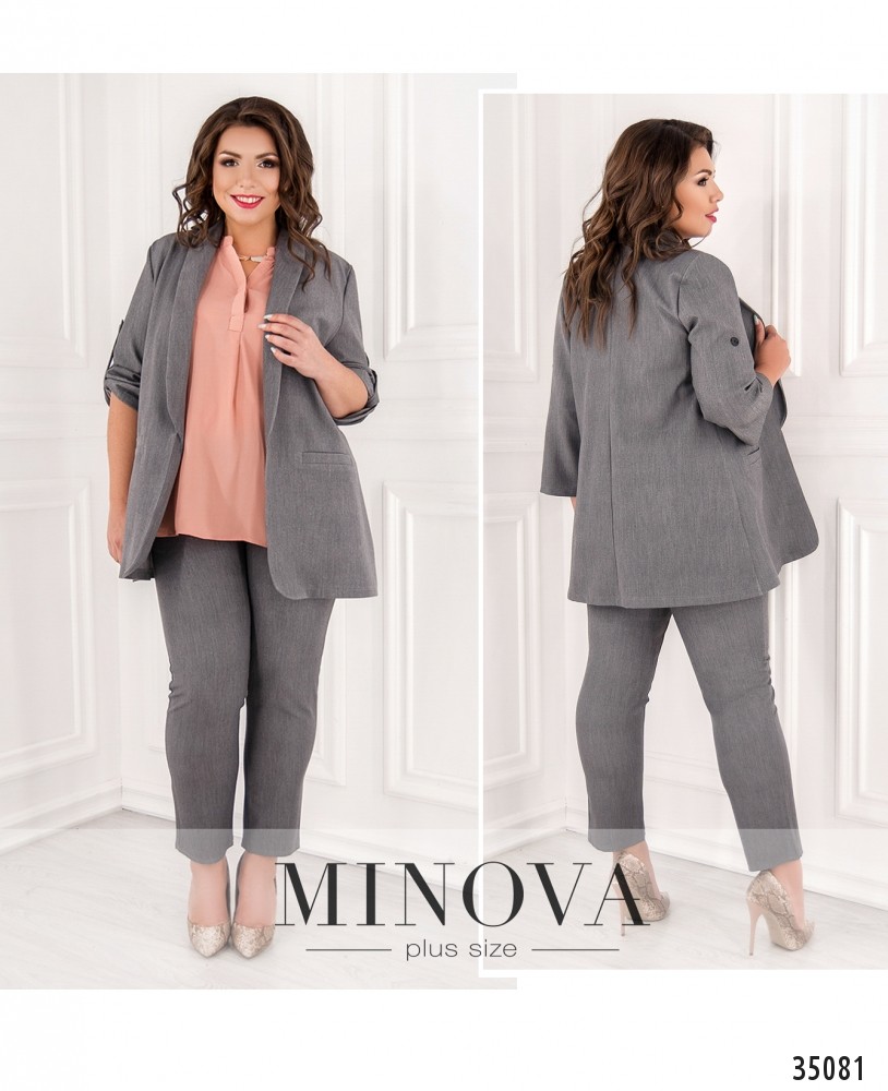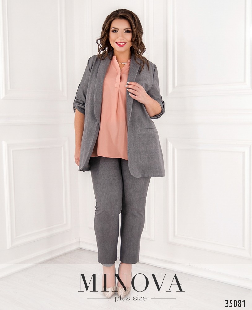 Стильный деловой костюм-двойка батал из новой коллекции женской одежды больших размеров прекрасно подойдёт для осеннего образа! Жакет длинный, без застёжек, с декоративными клапанами по бокам. Рукава полной длины, но могут укорачиваться с помощью ленты и пуговицы. Жакет без подкладки. Полочки с нестандартными лацканами. Брюки с высокой посадкой, слегка заужены к низу. На поясе – две пуговицы и ширинка с молнией, есть шлейки для пояса, по бокам – врезные карманы. Отличный выбор для сухой прохладной погоды!